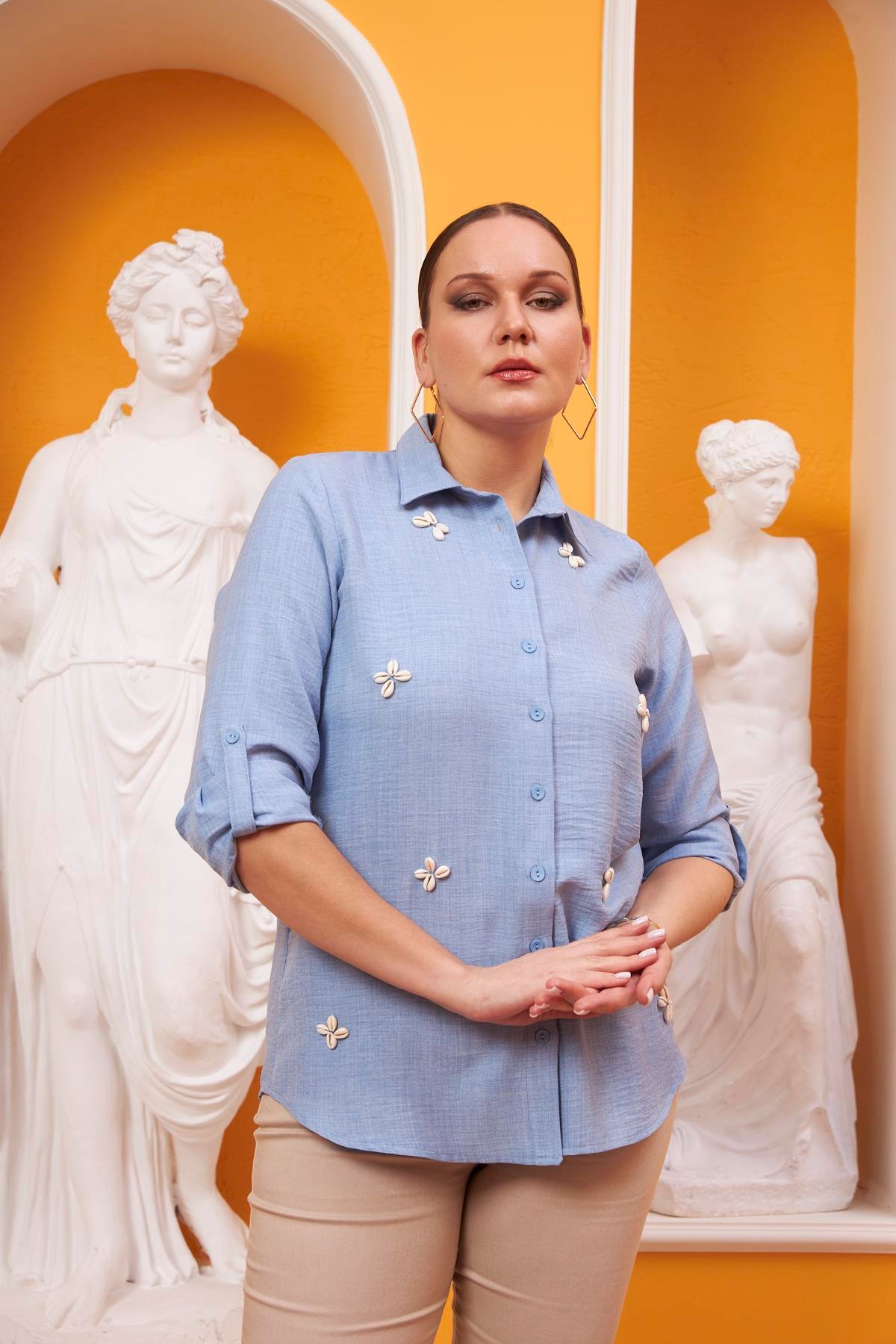 Deniz Kabuğu İşlemeli Büyük Beden Mavi Gömlek (O6332-MAVİ)