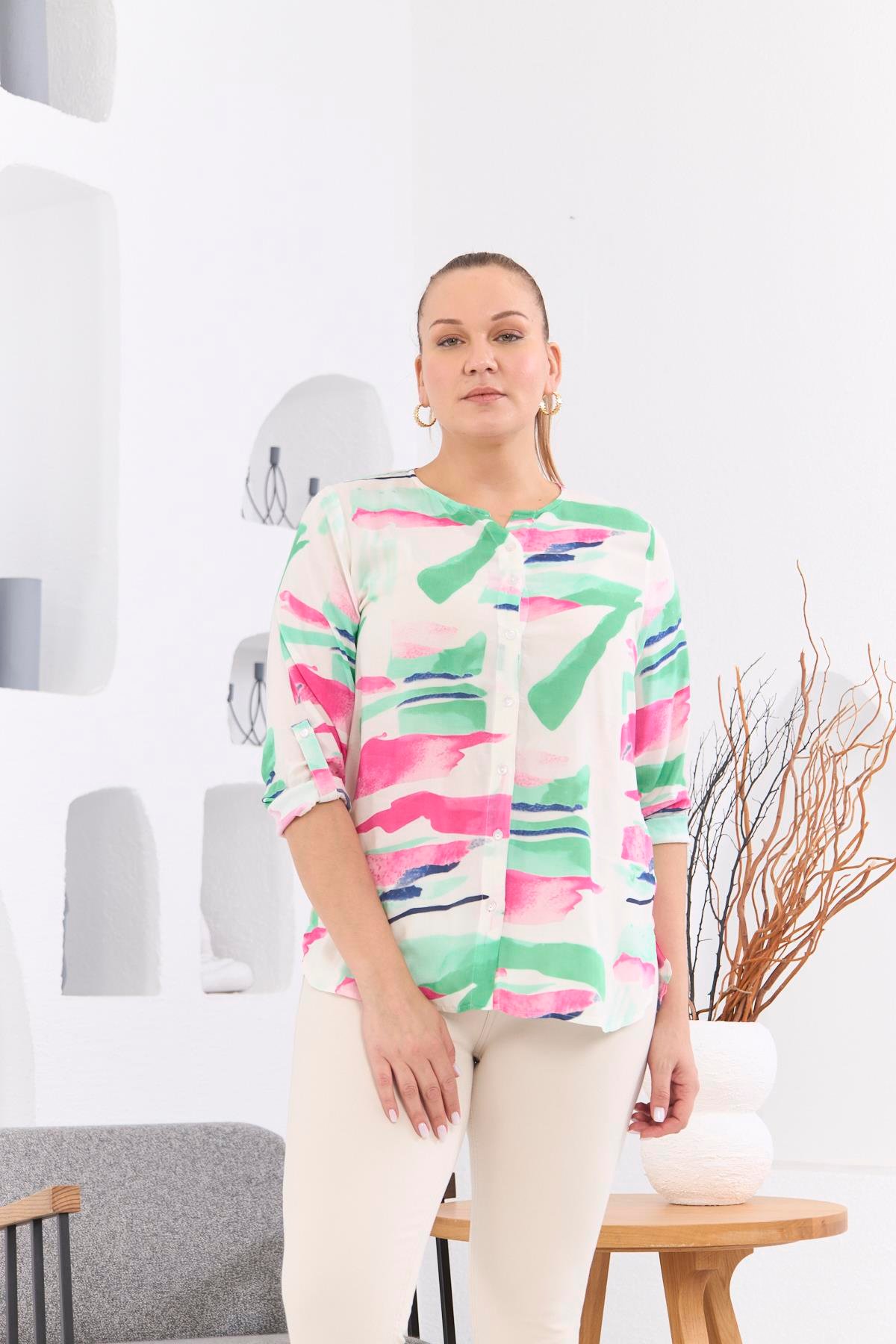 Desenli Vual Viskon Büyük Beden Düğmeli Yeşil Bluz (O6465-YEŞİL)