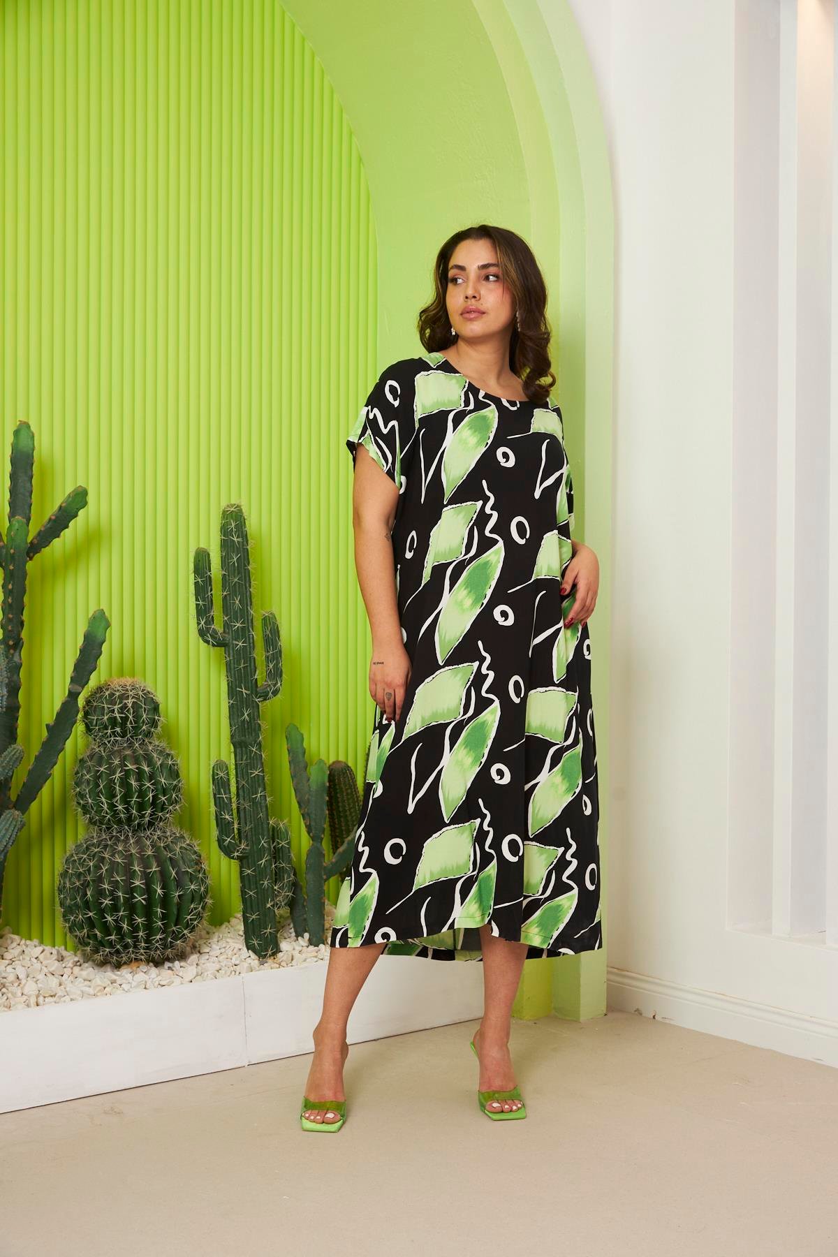 Desenli Büyük Beden Günlük Yeşil Elbise