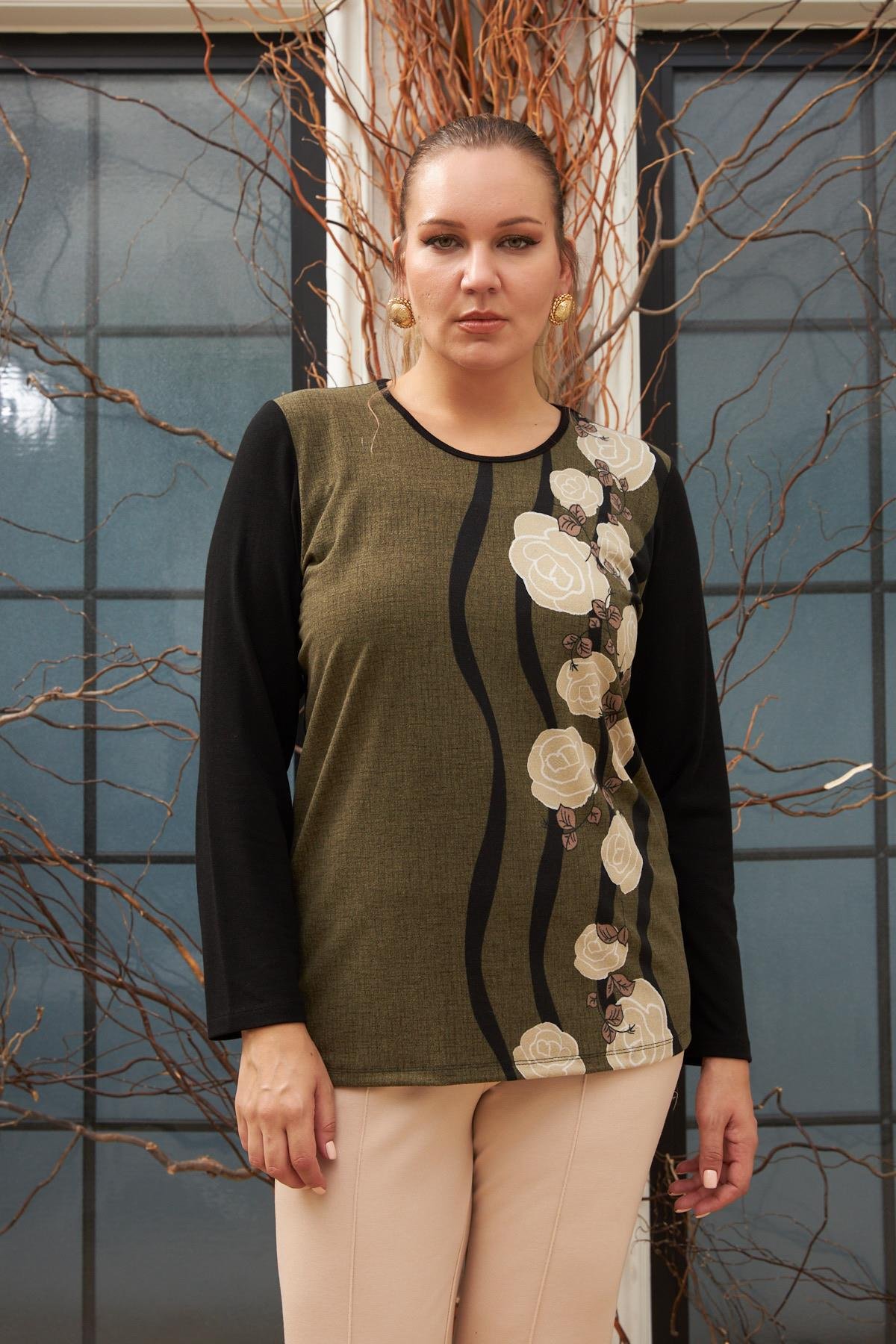 Desenli Büyük Beden Haki Bluz (O6177-HAKİ)