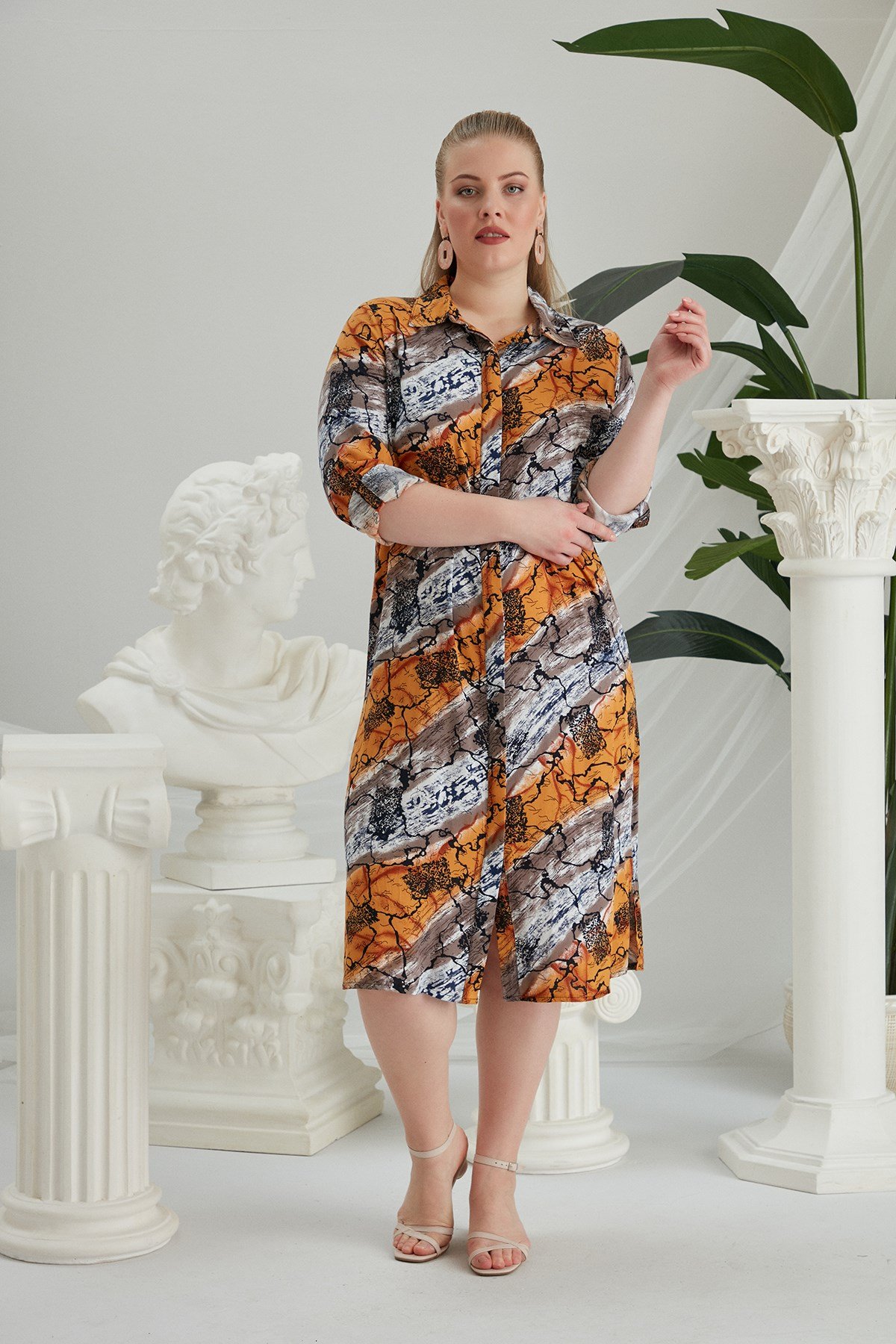 Rmg Desenli Büyük Beden Hardal Viskon Elbise