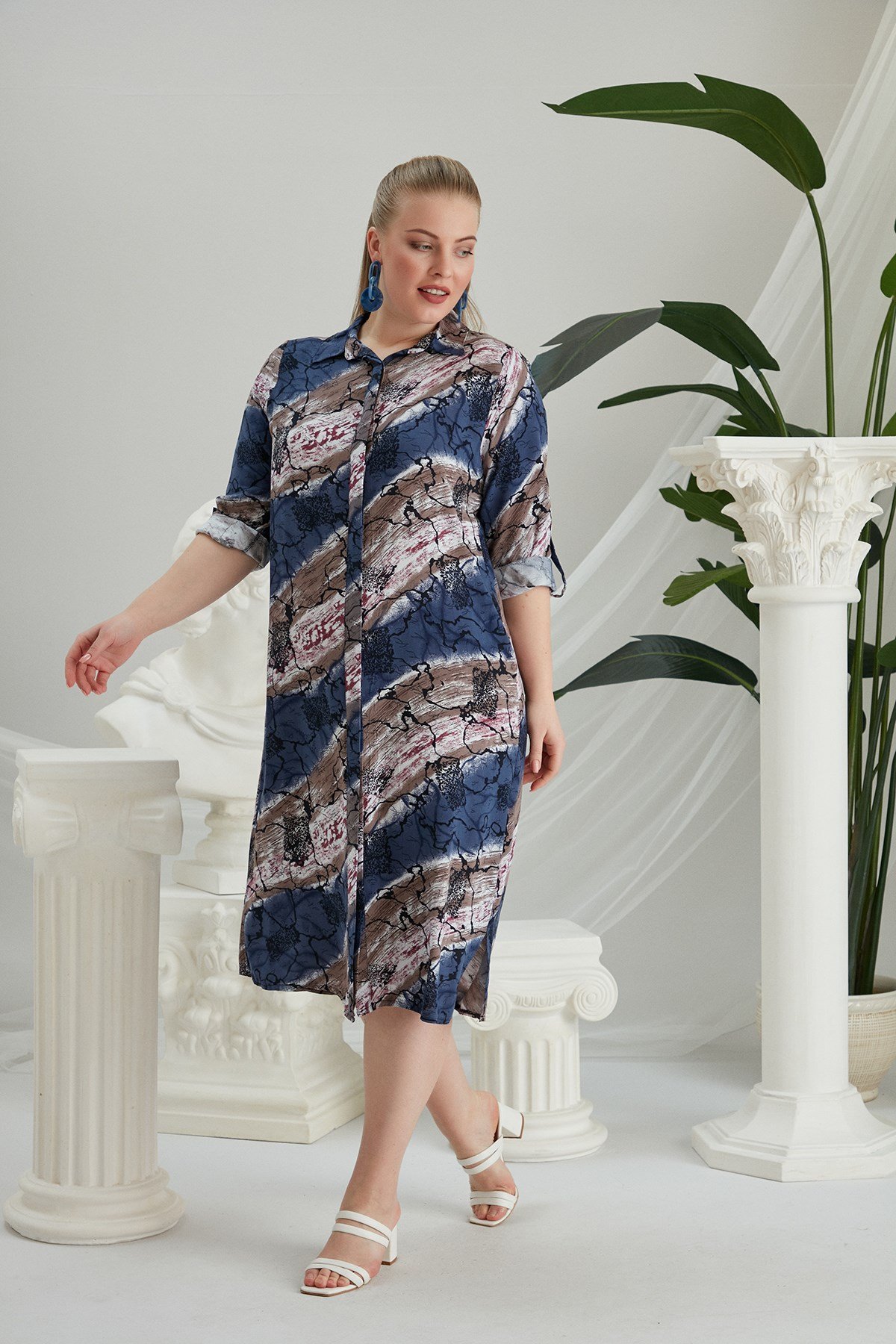 Rmg Desenli Büyük Beden Lacivert Viskon Elbise (O4429-LACİVERT)