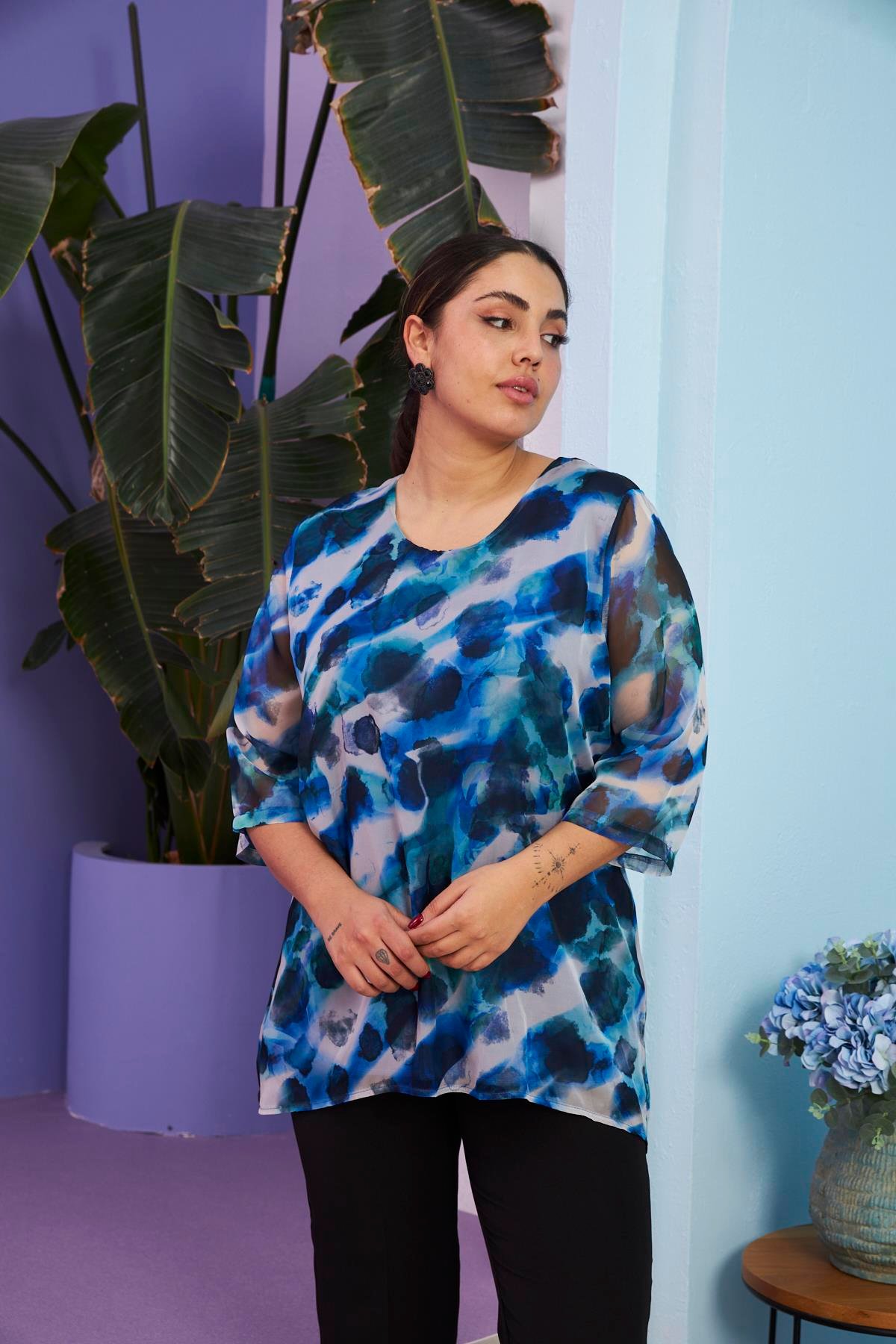 Desenli Büyük Beden Mavi Şifon Bluz (O6292-MAVİ)