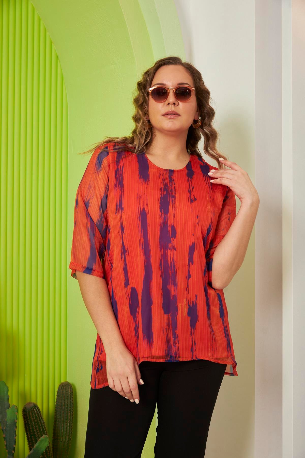 Desenli Büyük Beden Oranj Şifon Bluz (O6292-ORANJ)