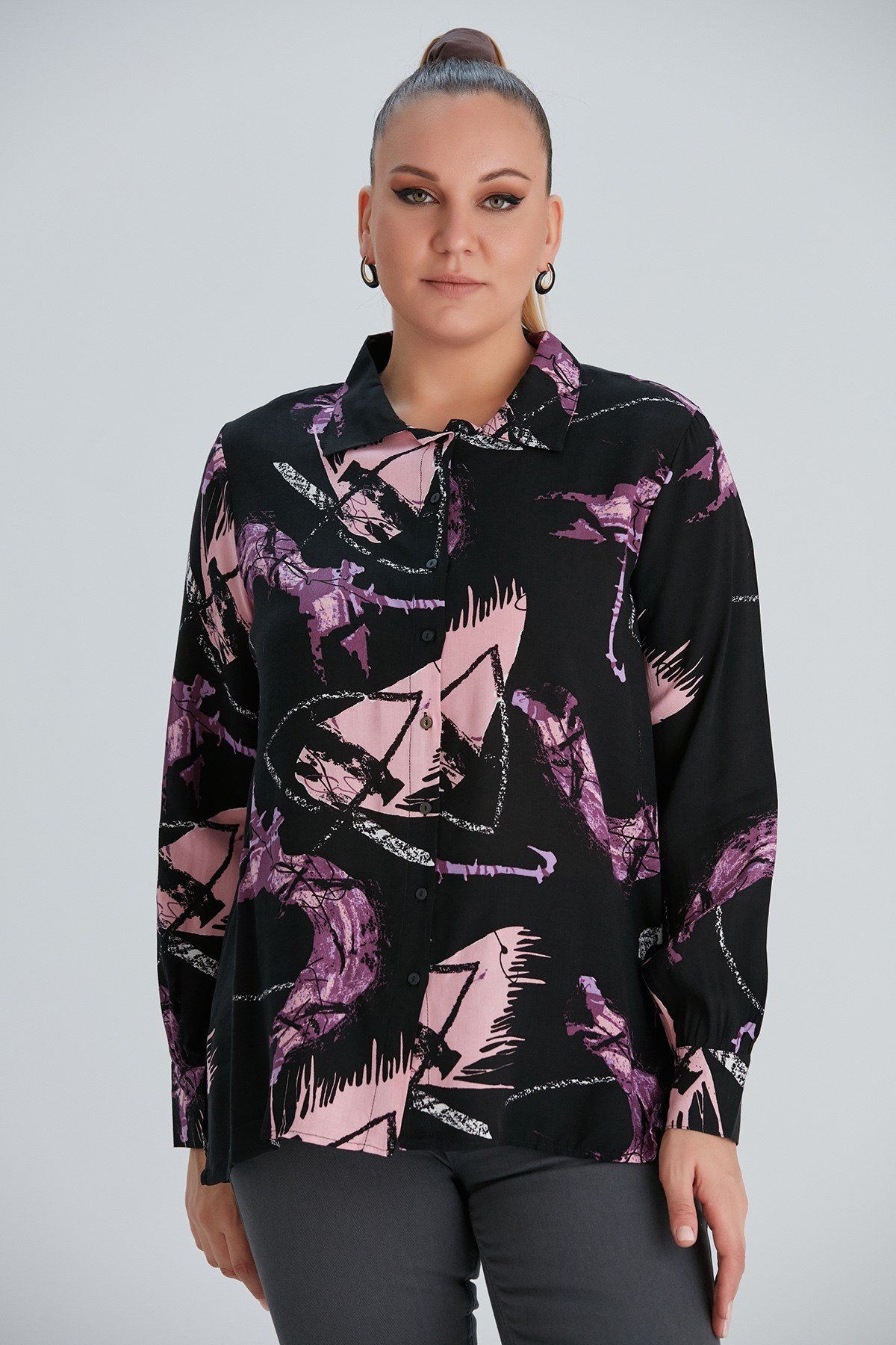 Rmg Desenli Büyük Beden Uzun Kol Siyah Gömlek