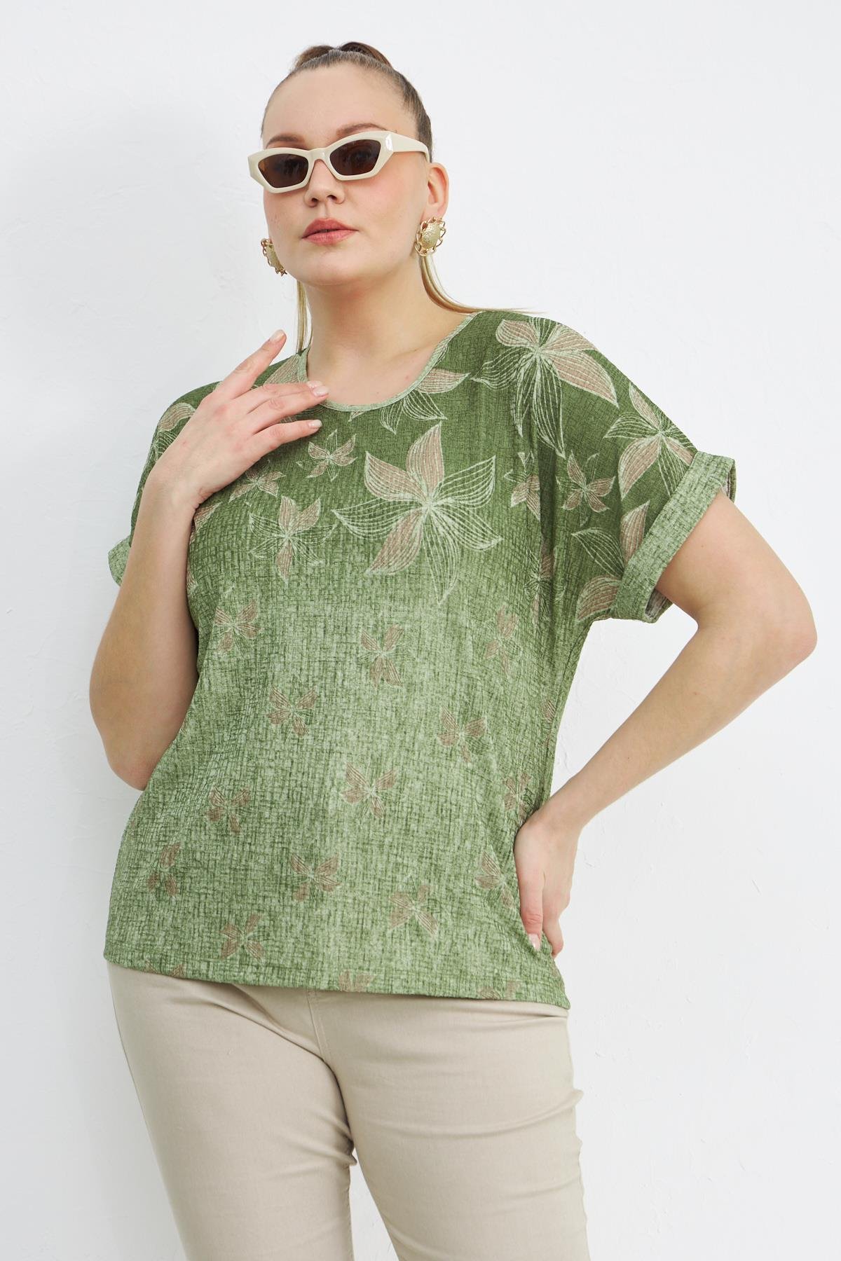 Desenli Kol Detaylı Büyük Beden Oliv Tişört (O6033-OLİV)