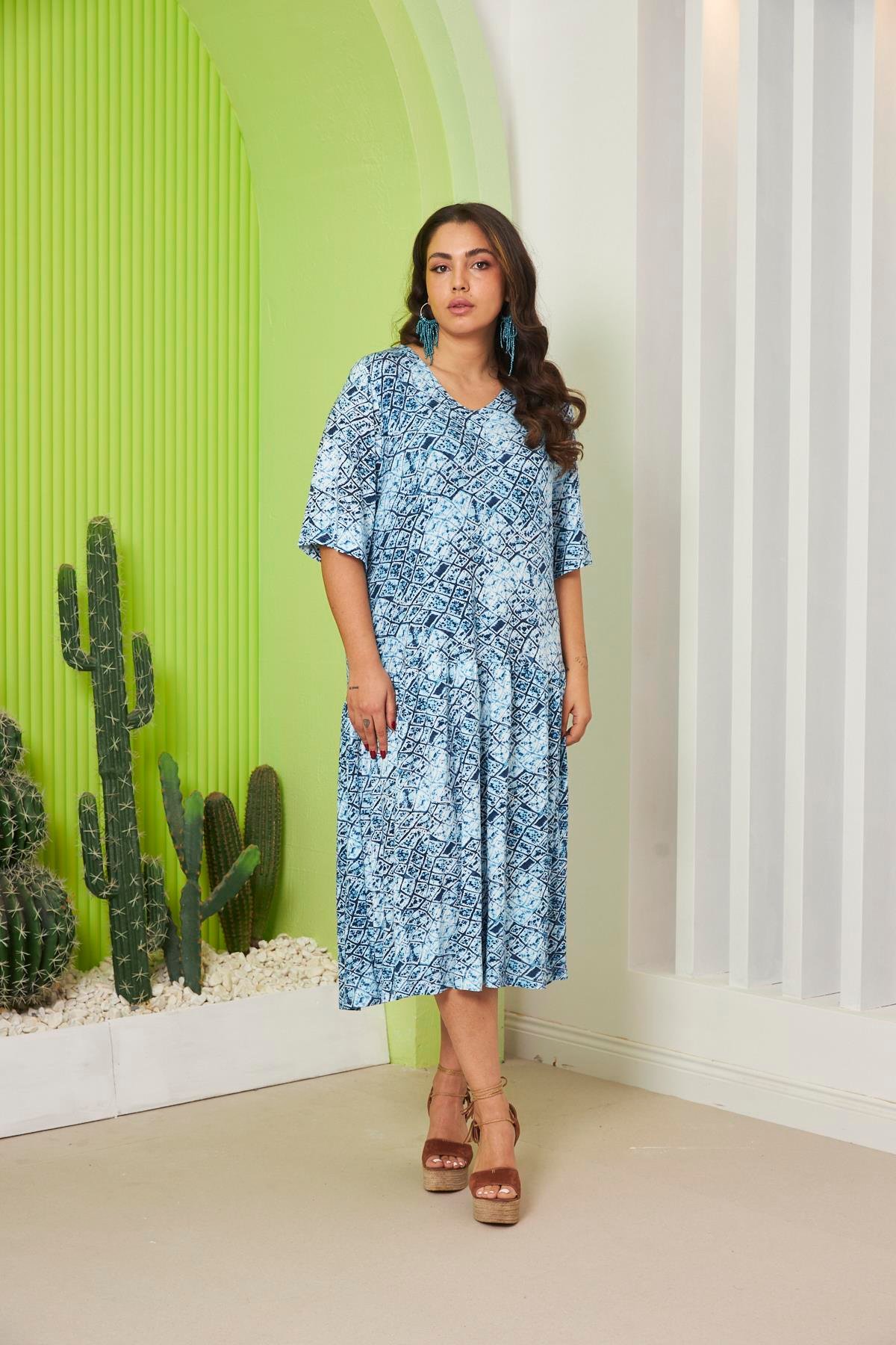 RMG Desenli V Yaka Örme Büyük Beden Elbise Mavi