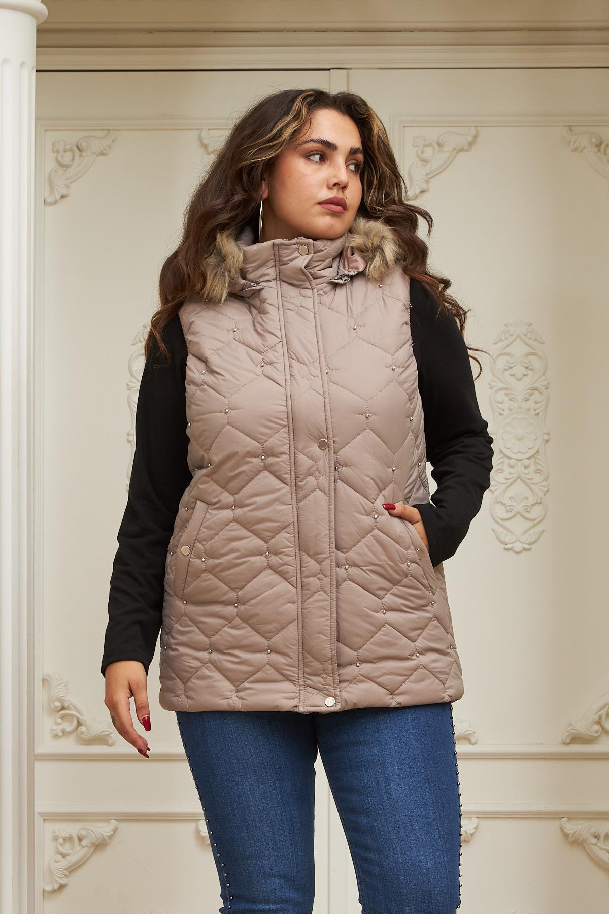 Droplu Kadın Büyük Beden Vizon Kapitone Yelek