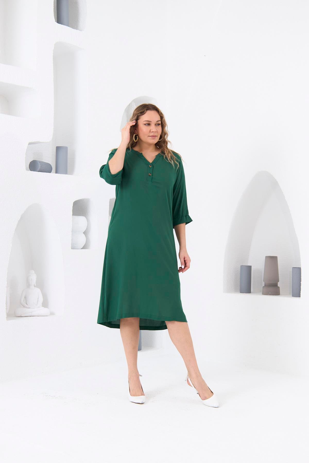 Düğme Detaylı Büyük Beden Yeşil Viskon Elbise (O6354-YEŞİL)