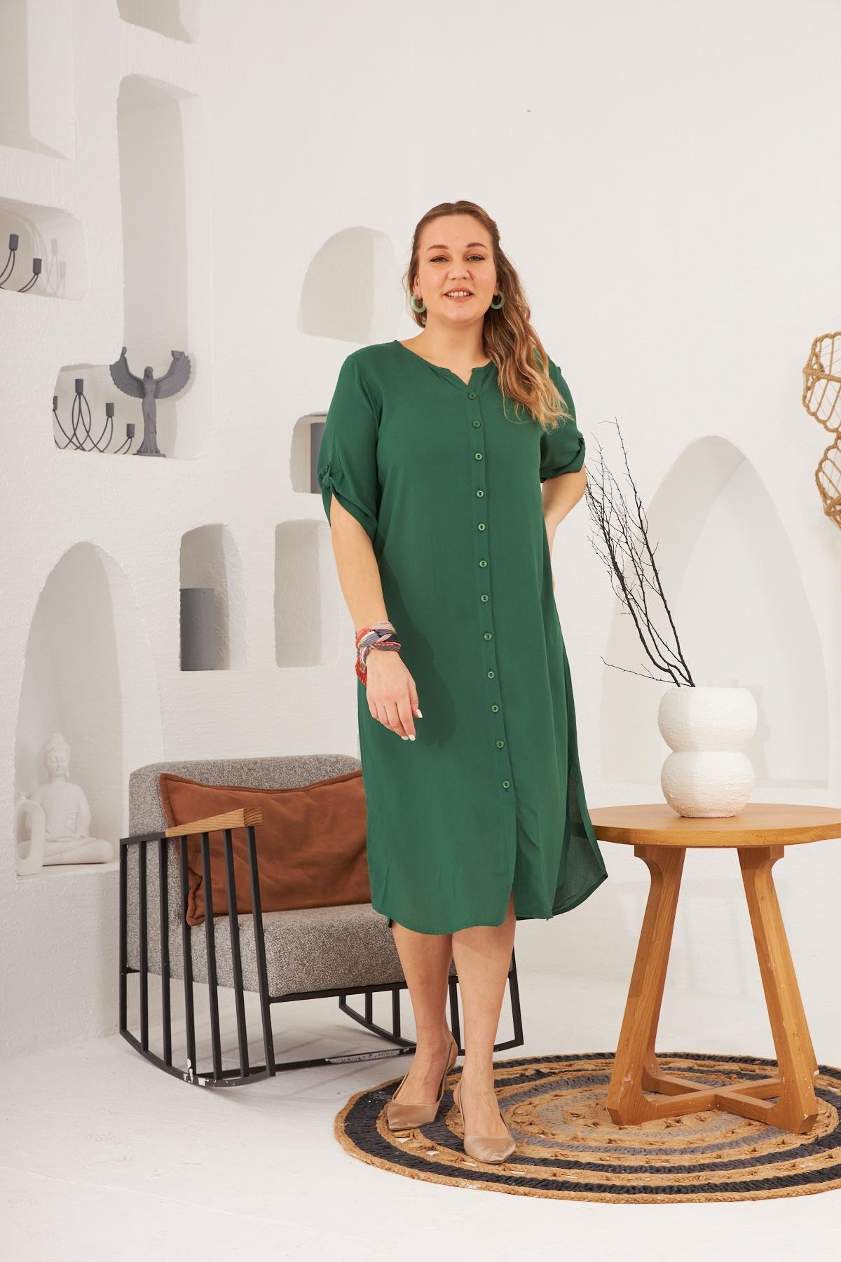 Düğmeli Kol Detaylı Büyük Beden Zümrüt Elbise (O6390-ZÜMRÜT)