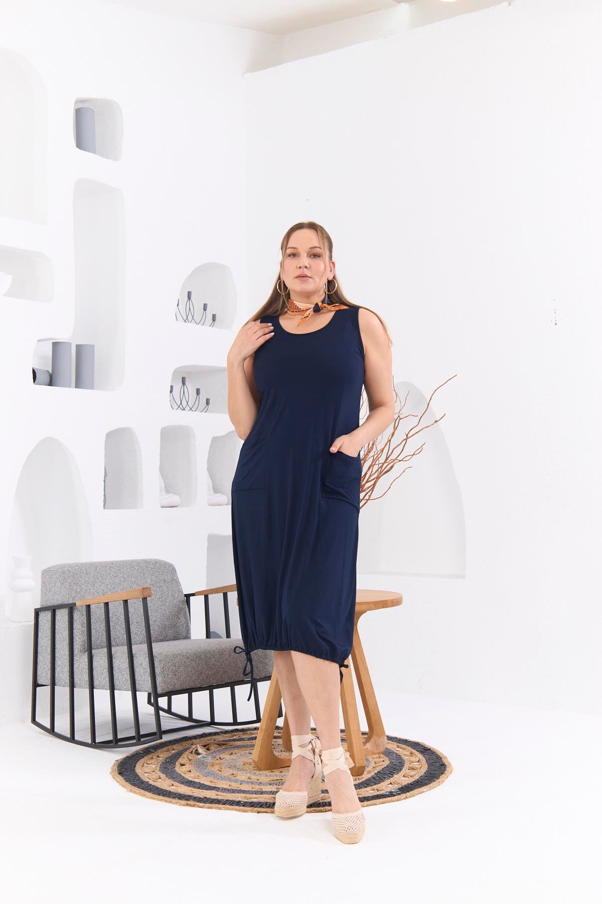 Eteği Bağlamalı Büyük Beden Lacivert Elbise (O6351-LACİVERT)
