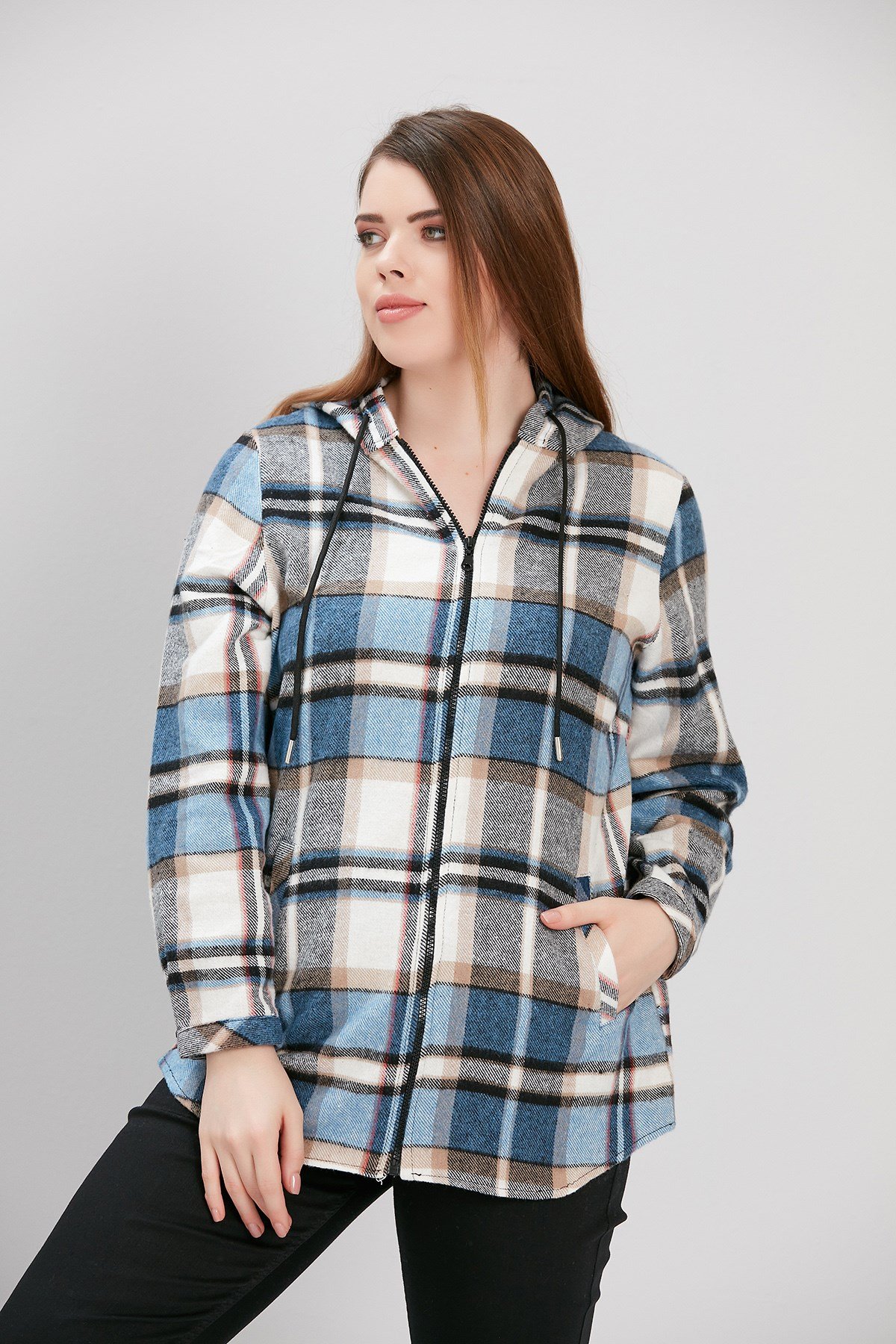 Rmg Fermuar Detaylı Büyük Beden İndigo-Krem Ekose Gömlek