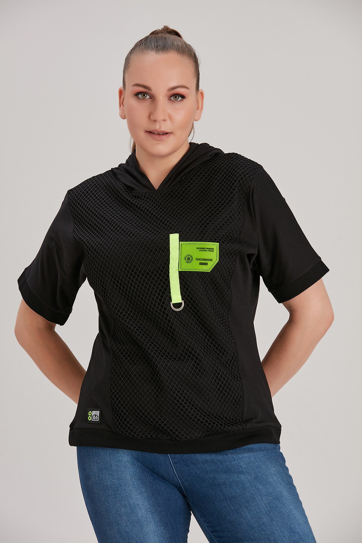 Rmg File Detaylı Büyük Beden Kapşonlu Siyah Tişört (O4653-SİYAH)