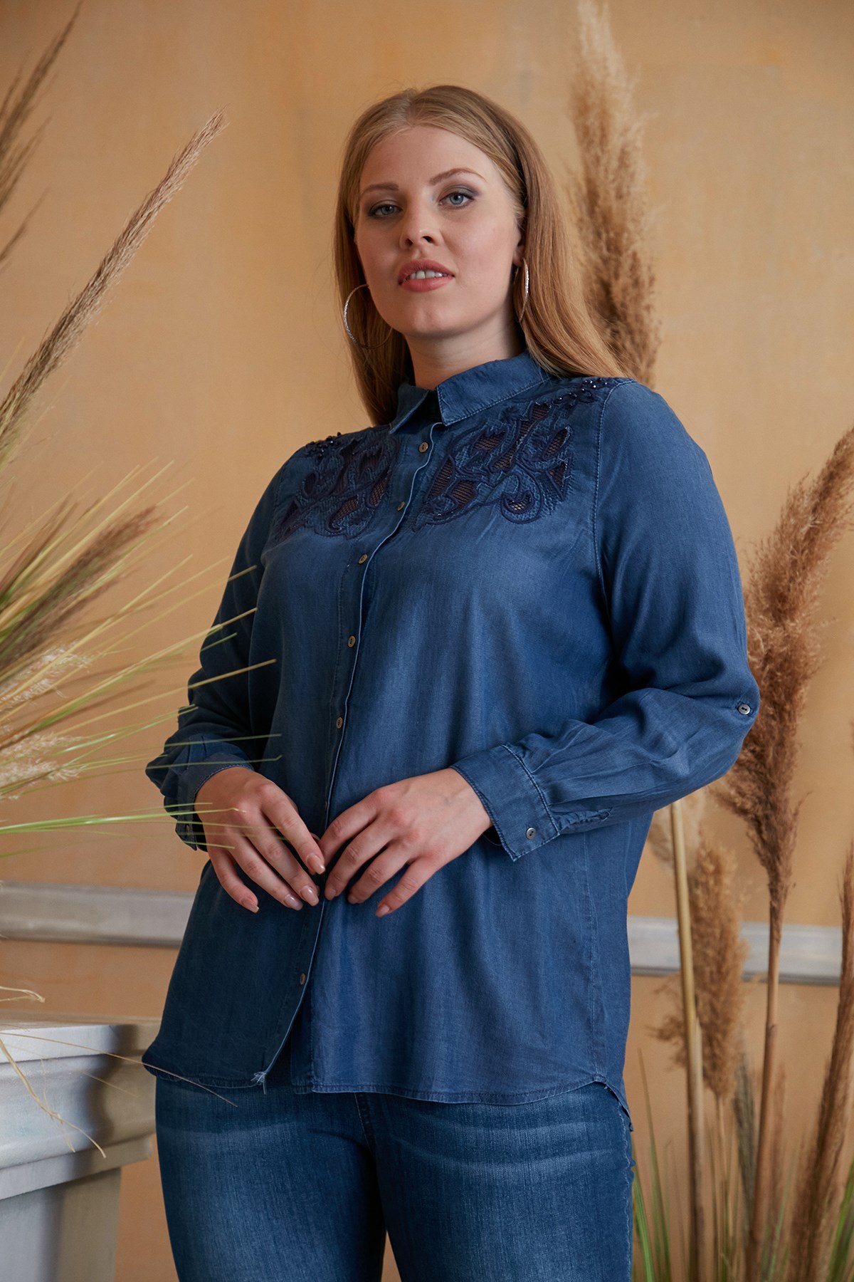 File detaylı büyük beden kim mavi gömlek, günlük yaşamda kullanabileceğiniz tarzdadır. Ürünün yaka bölgesinde file detayları mevcuttur, kot görünümü ile de günlük yaşamınızda spor şıklığını yakalayabilirsiniz. Küçük metal  düğmelerin yer aldığı gömlek, kolay yıkanma ve kolay ütülenme özelliğine sahiptir. Bahar aylarında kullanılabileceği gibi yaz aylarında da rahatlıkla tercih edilebilir.