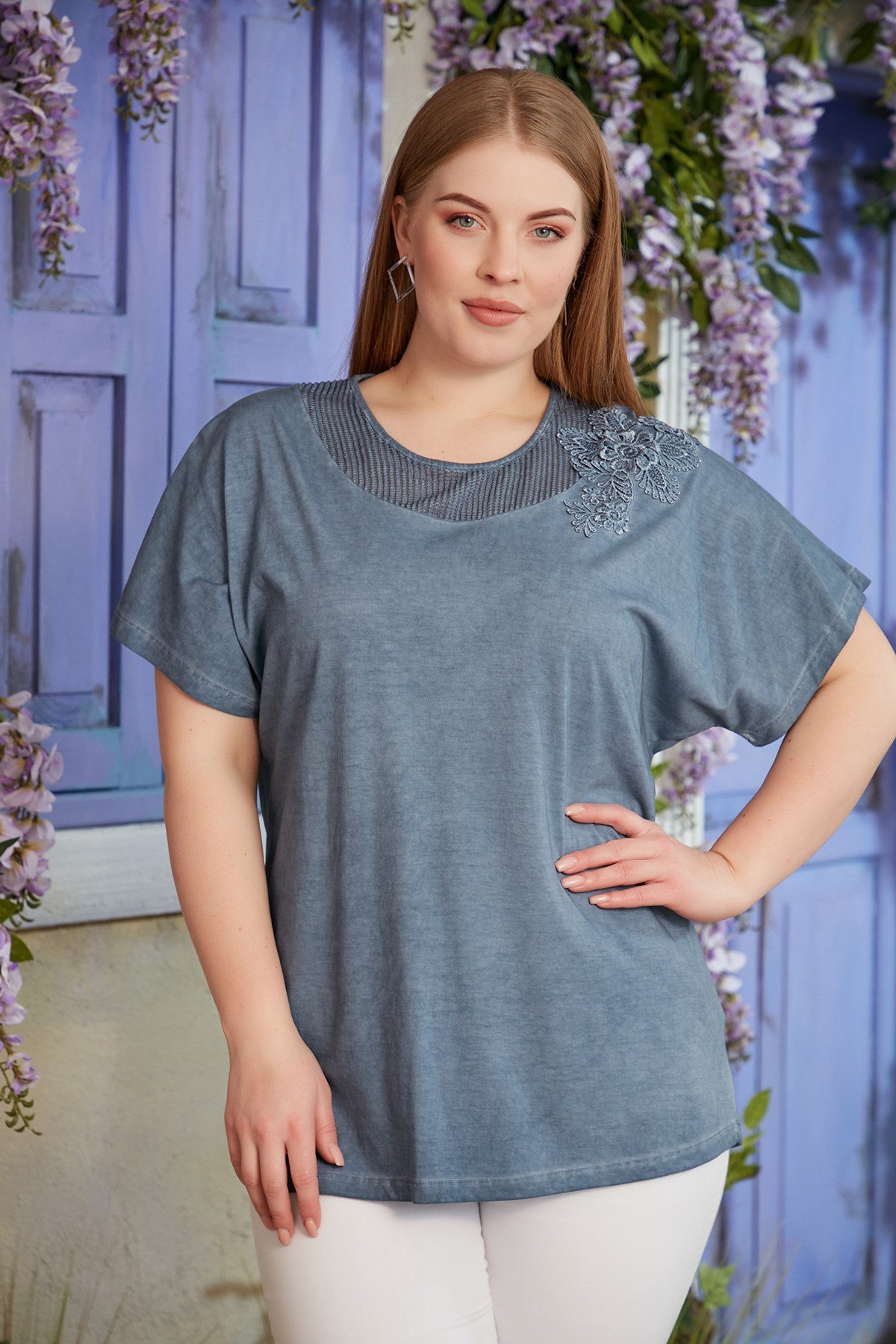 Rmg File ve Aplike Detaylı Büyük Beden İndigo Tişört (O4923-İNDİGO)