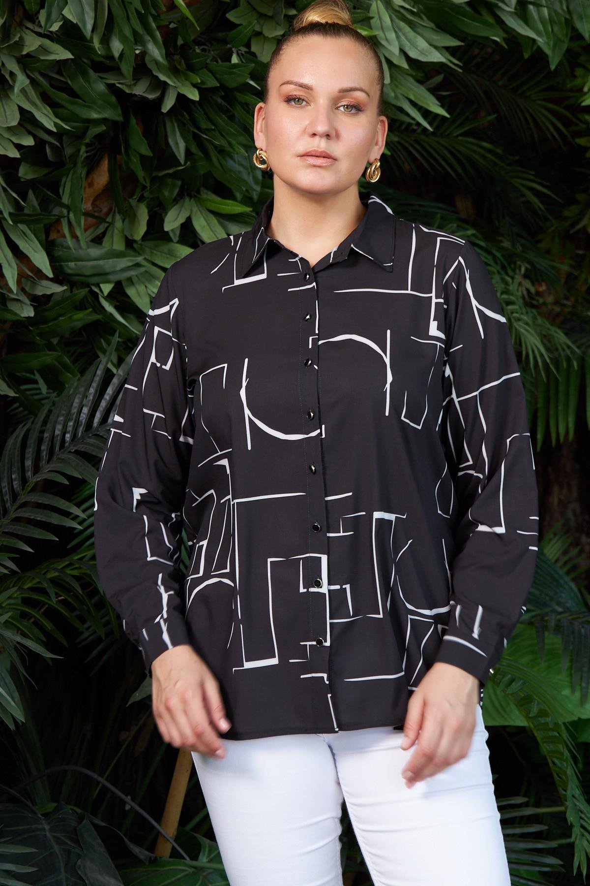 Geometrik Desenli Uzun Kol Büyük Beden Siyah Gömlek
