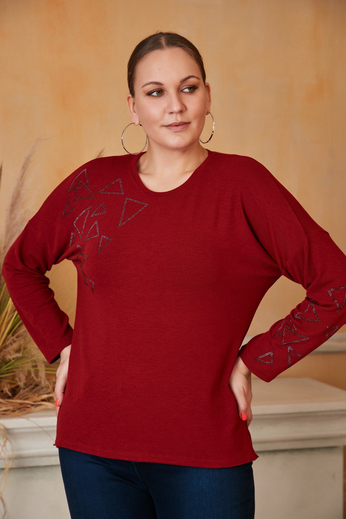 Rmg Geometrik Taş İşlemeli Büyük Beden Bordo Bluz (O4382-BORDO)