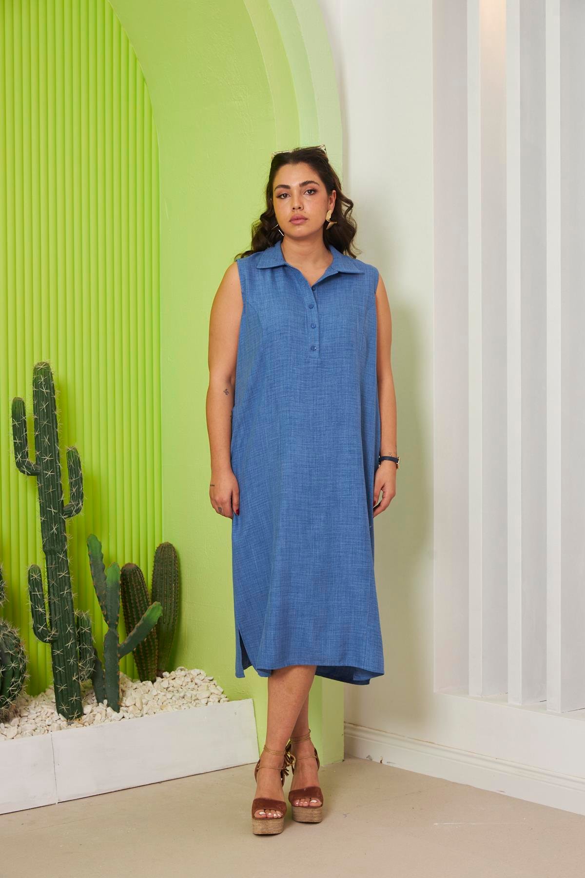 Gömlek Yaka Cep Detaylı Kolsuz Büyük Beden Elbise İndigo (O6355-İNDİGO)