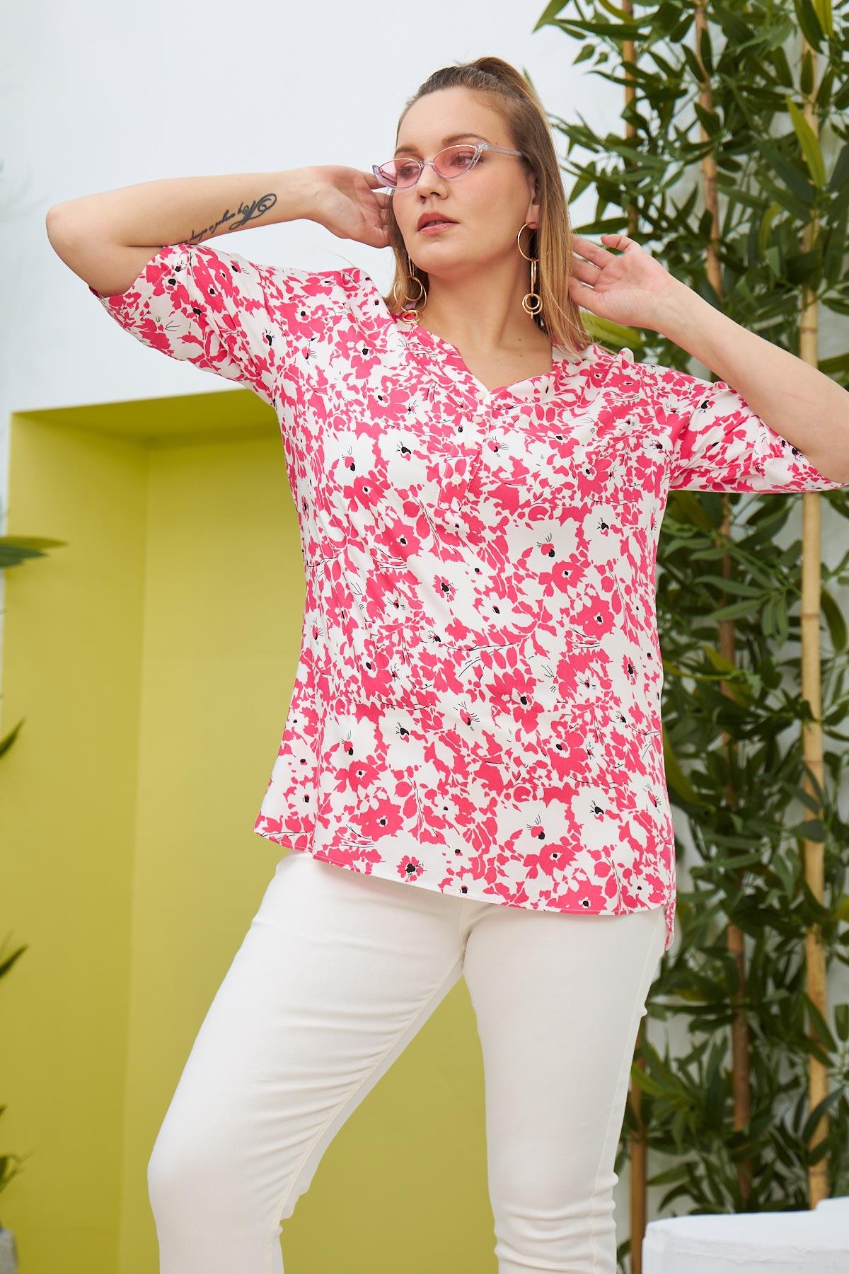 Rmg Hakim Yaka Çiçek Desenli Büyük Beden Fuşya Bluz (O6073-FUŞYA)