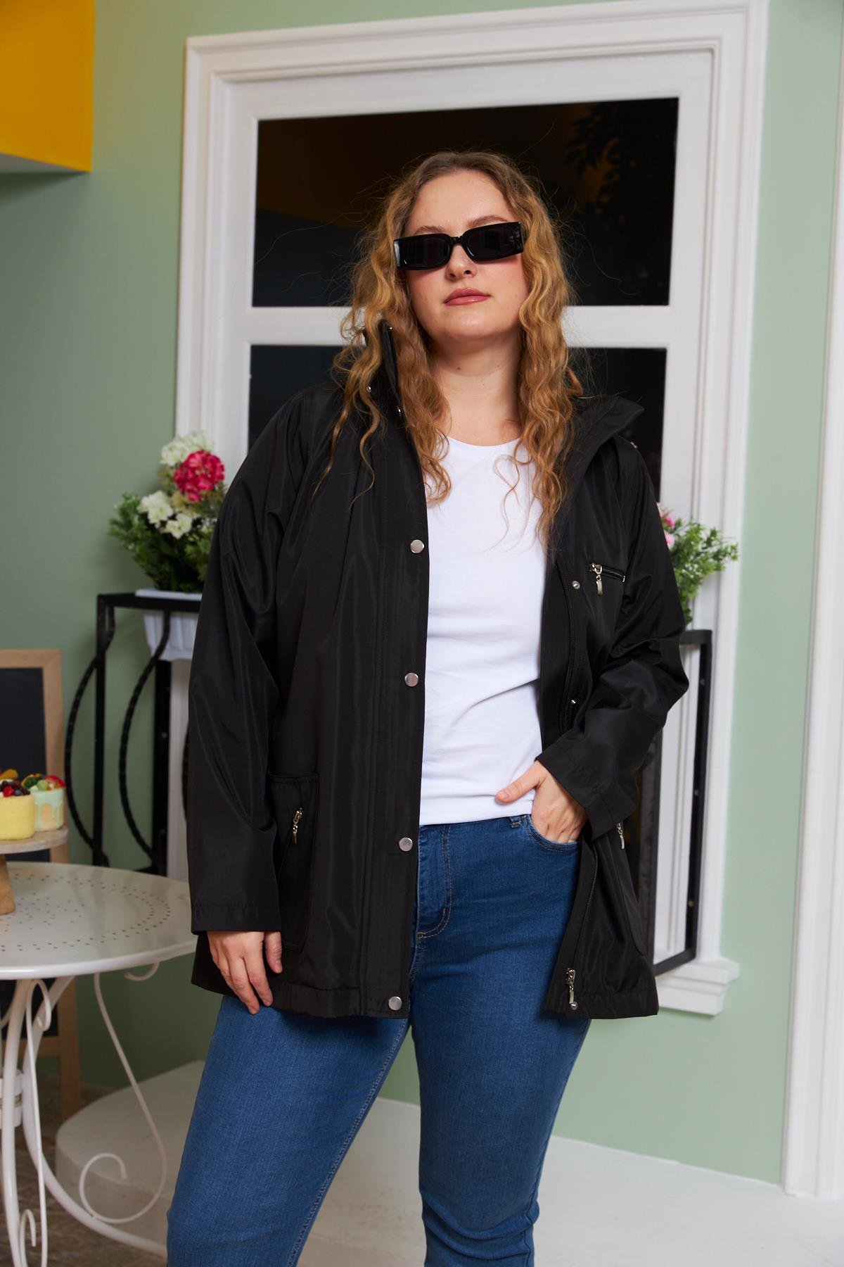 İç Astar Ekose Detaylı Büyük Beden Siyah Trençkot (9744-SİYAH)