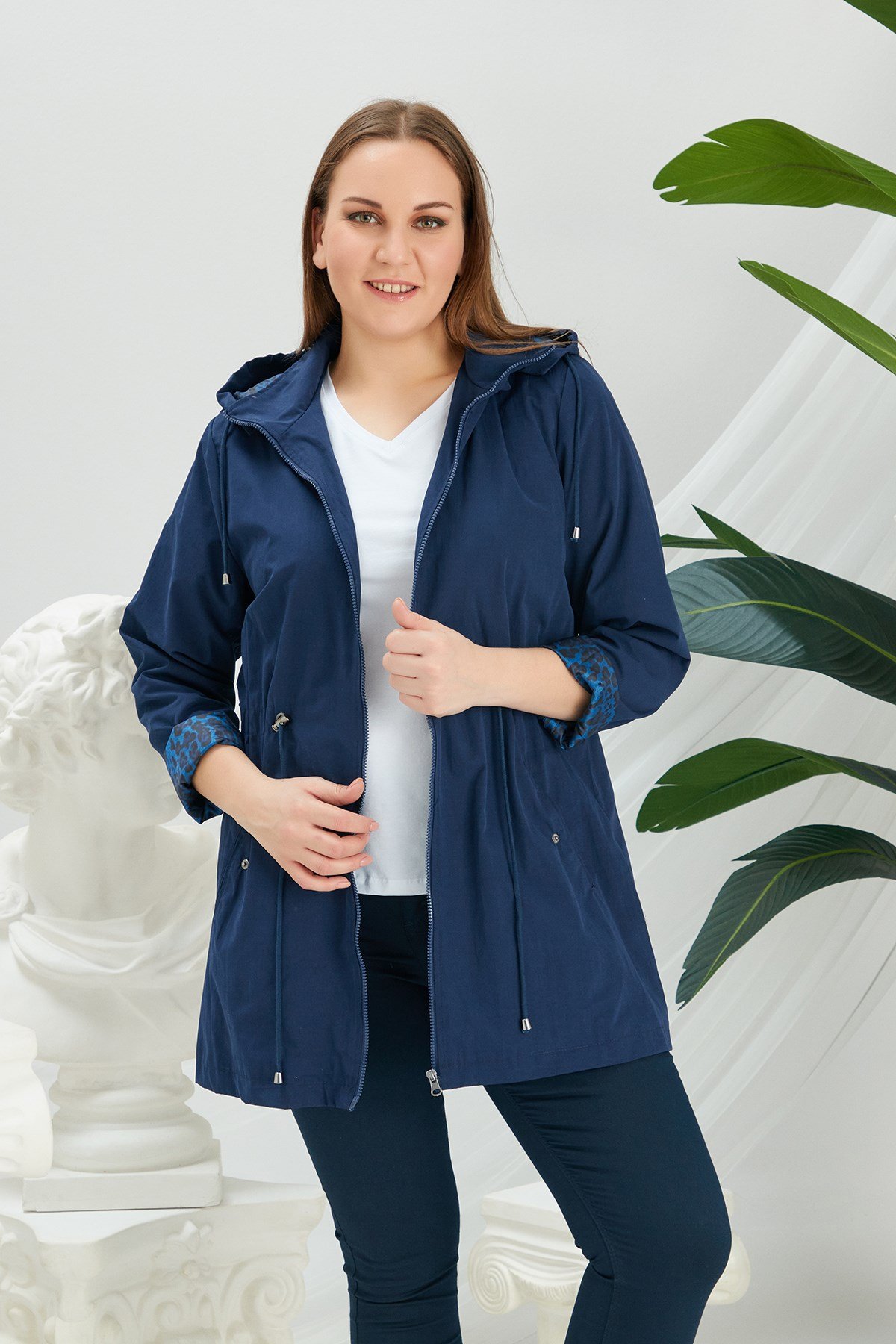 Rmg İç Astar Leopar Desenli Büyük Beden Lacivert Trençkot (9747-LACİVERT)