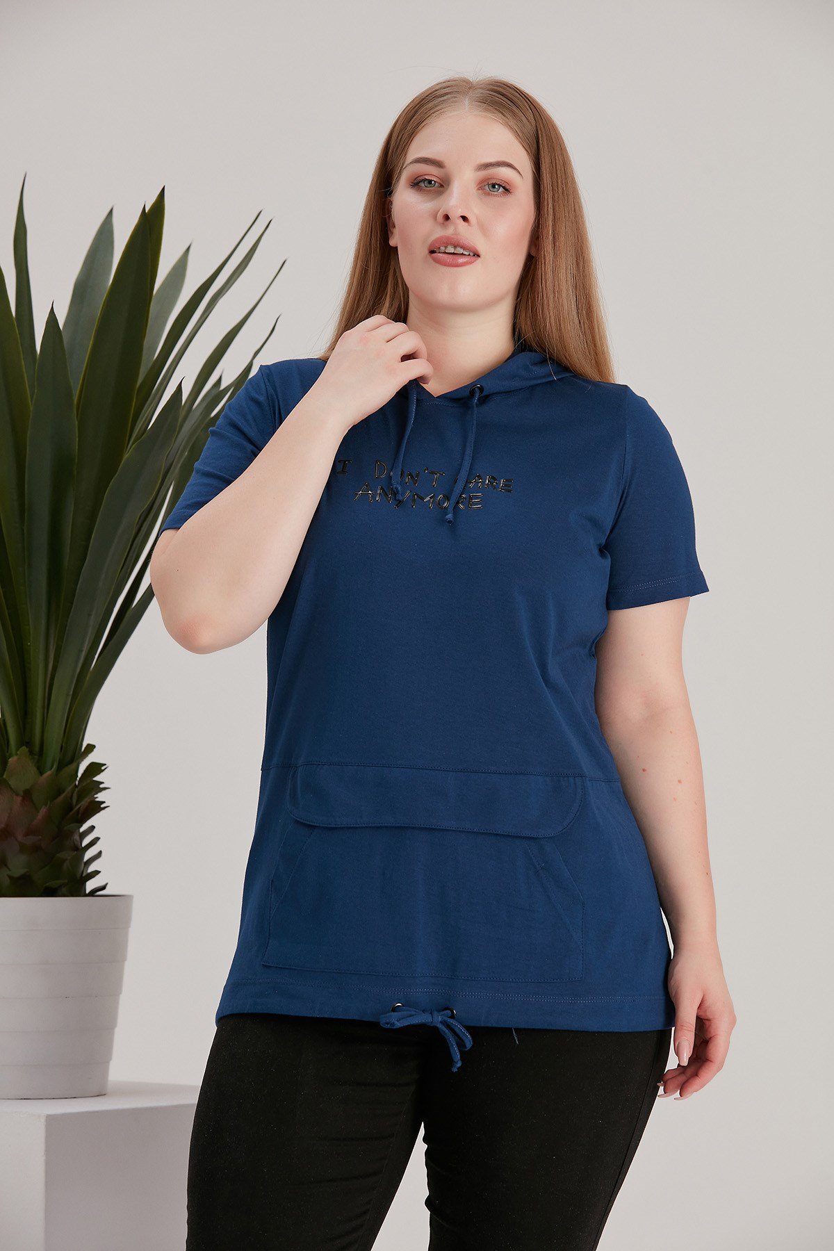 Rmg Kanguru Cepli Kapşonlu Büyük Beden İndigo Tişört (O4652-İNDİGO)