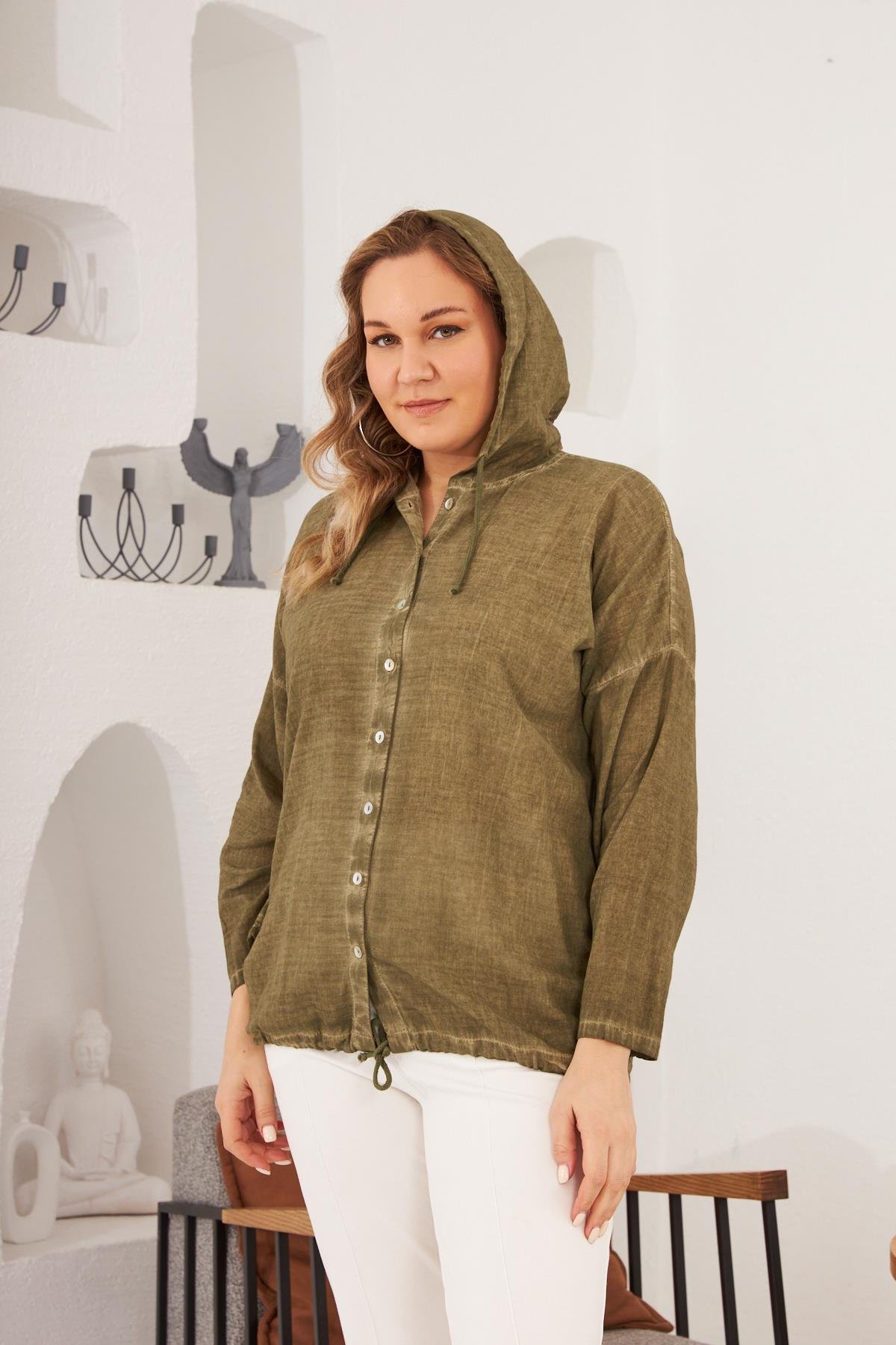Kapşonlu Büyük Beden Haki Yıkamalı Gömlek