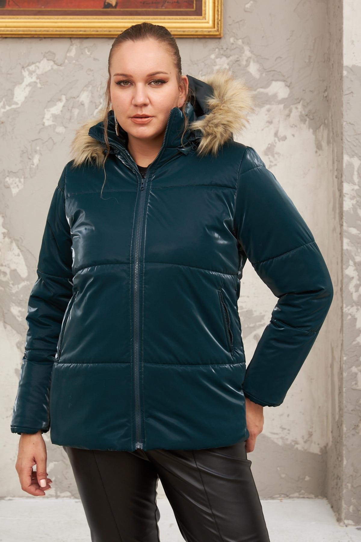 Kapşonlu Parlak Kumaş Büyük Beden Petrol Şişme Mont