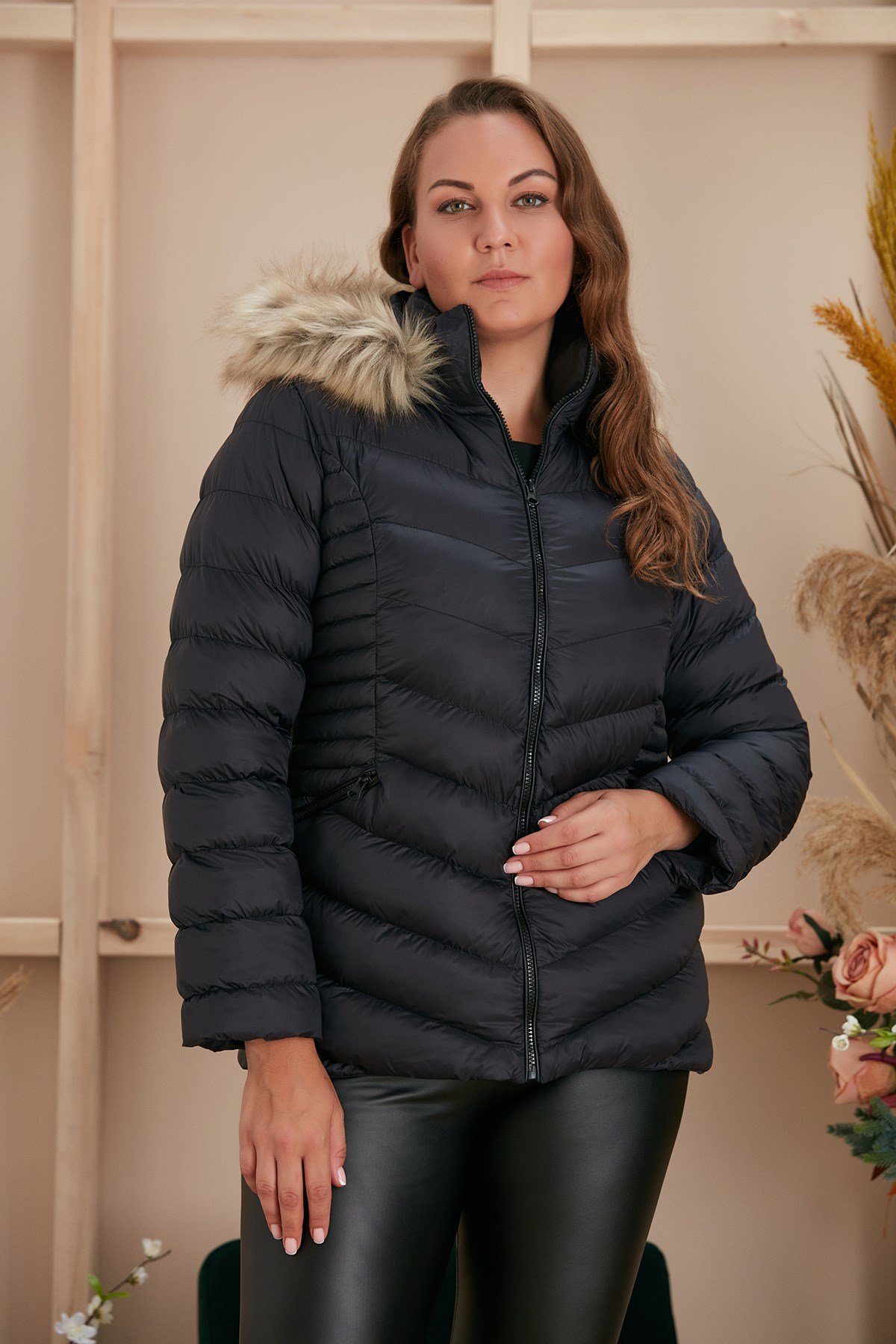 Rmg Yaka Kürklü Büyük Beden Siyah Kapitone Mont