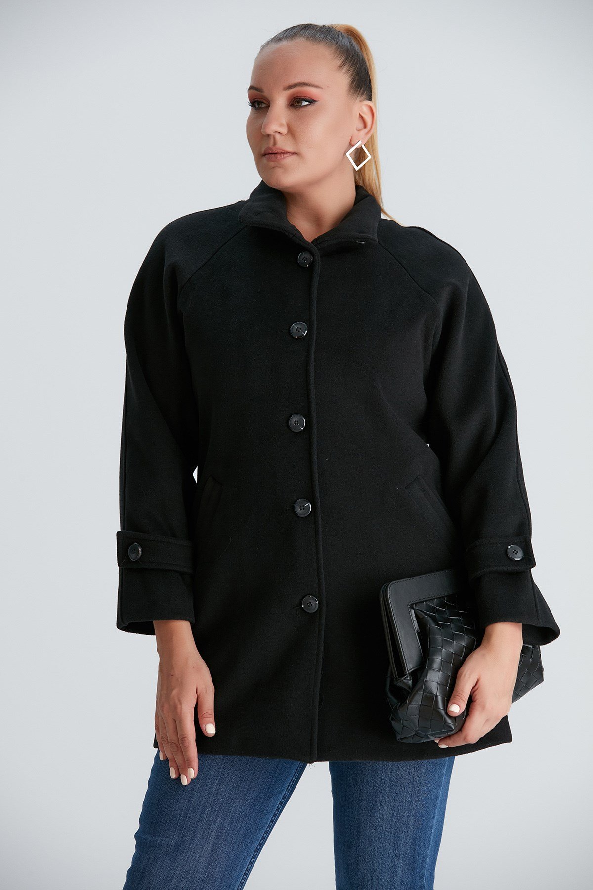 Rmg Kol Detaylı Büyük Beden Siyah Kaşe Kaban