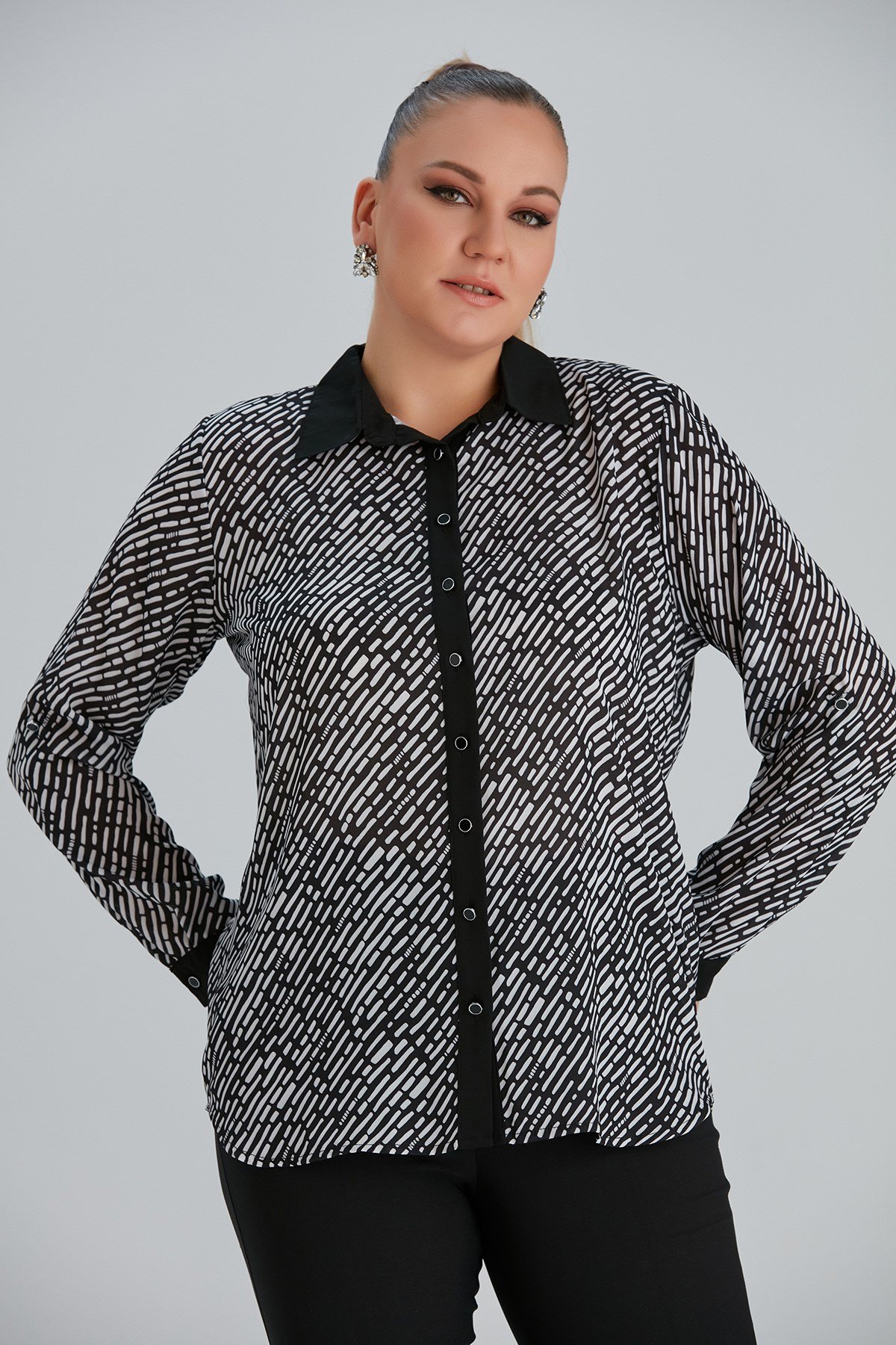 Kol Detaylı Desenli Büyük Beden Siyah Gömlek