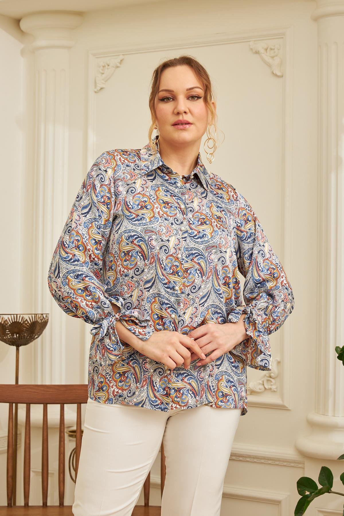 Kol Fırfır Ve Bağcık Detaylı Çiçek Desenli Büyük Beden İndigo Gömlek