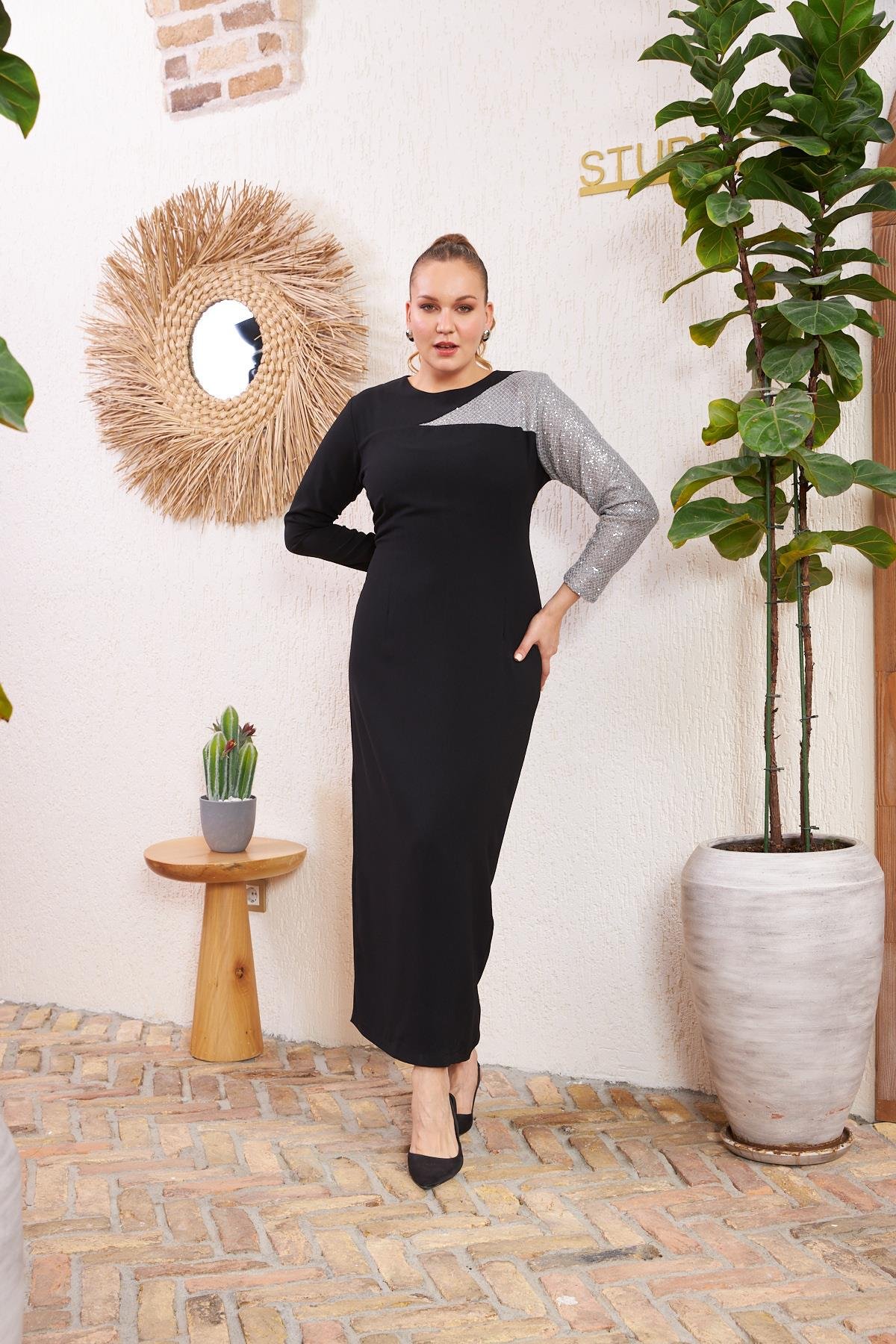 Kol Garnili Büyük Beden Siyah Elbise (O6103-SİYAH)