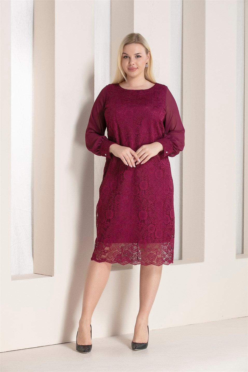 Rmg Kol Tül Detaylı Büyük Beden Dantel Elbise Mürdüm (6578Y-MRD)