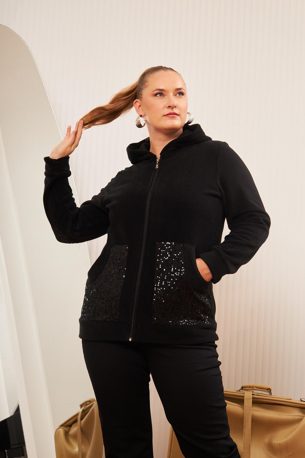 Kol Ve Cep Pul Payet İşlemeli Büyük Beden Siyah Hırka (9737-SİYAH)