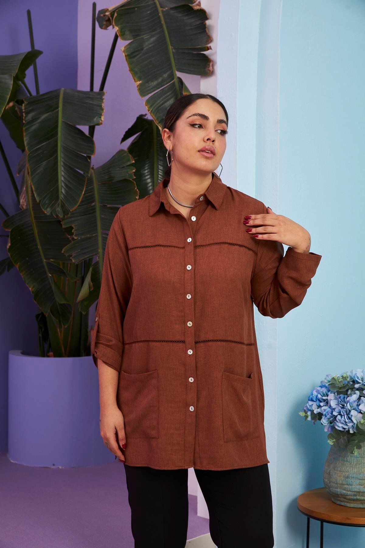 Kol Ve Kroşeta Detaylı Büyük Beden Kahve Gömlek (O4764-KAHVE)