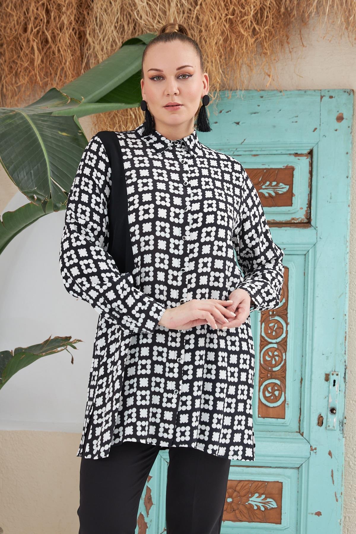 Kol Ve Omuz Detaylı Büyük Beden Siyah Desenli Gömlek (O5097-SİYAH)