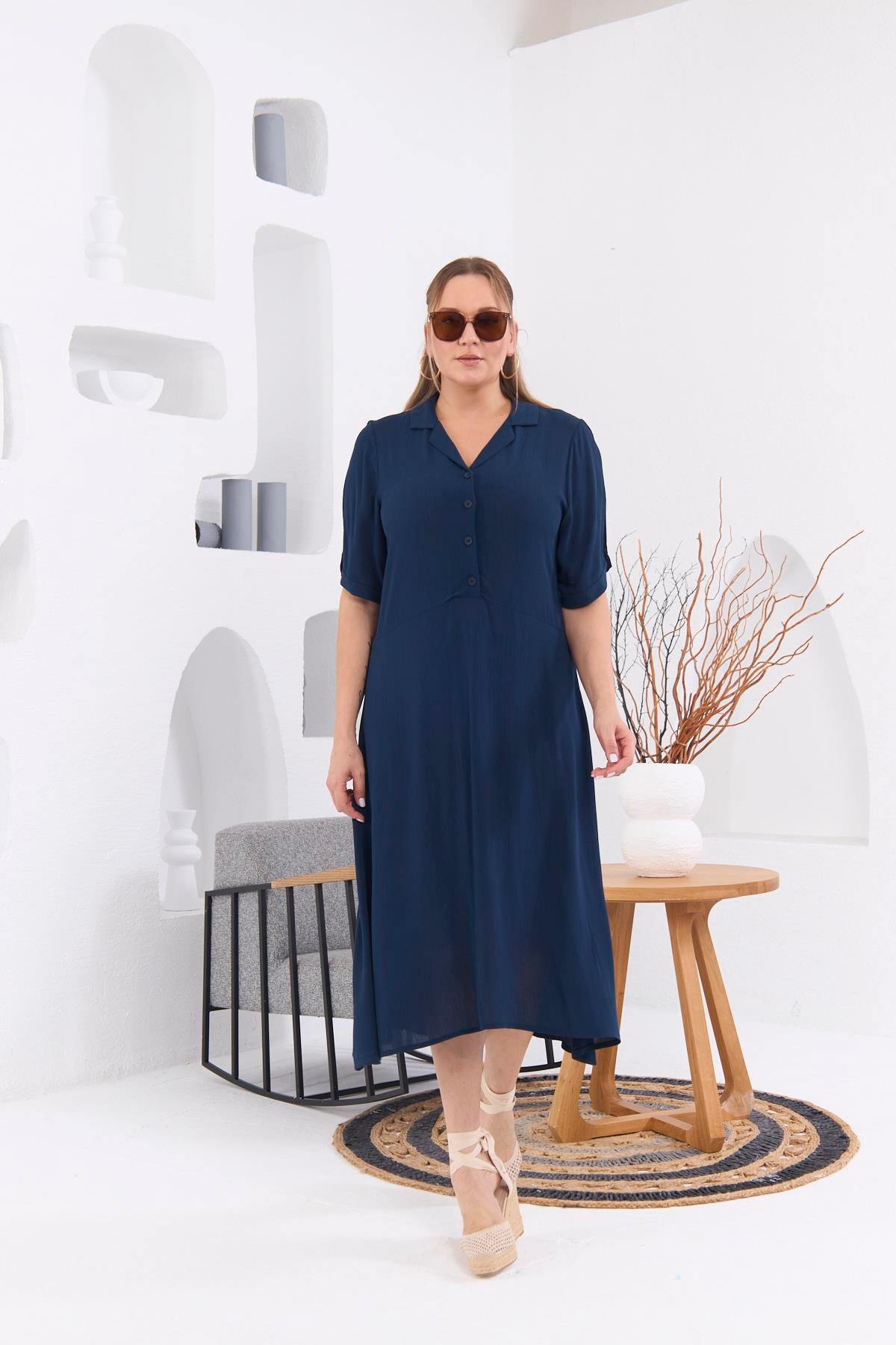 Kol Yırtmaç Detaylı Büyük Beden Lacivert Viskon Elbise (O6392-LACİVERT)