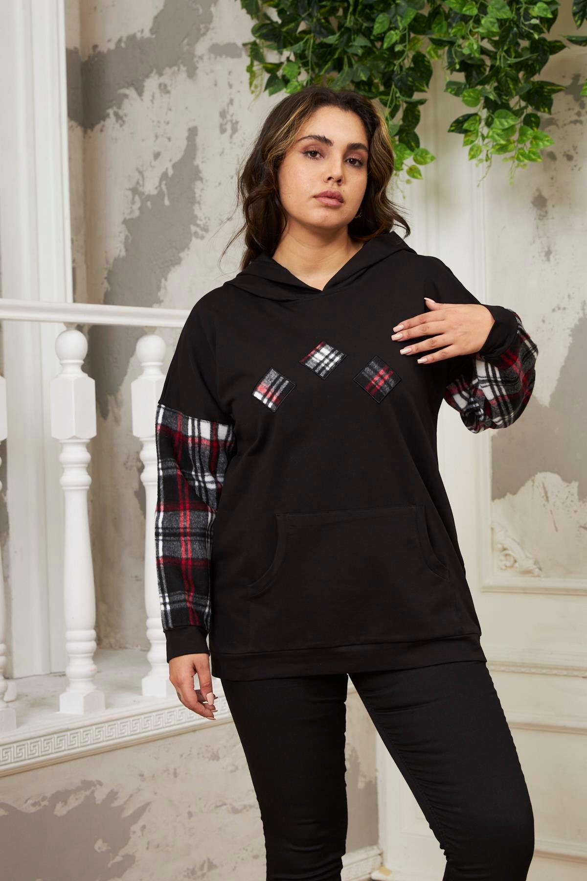 Kollar Ekose Büyük Beden Siyah Sweatshirt