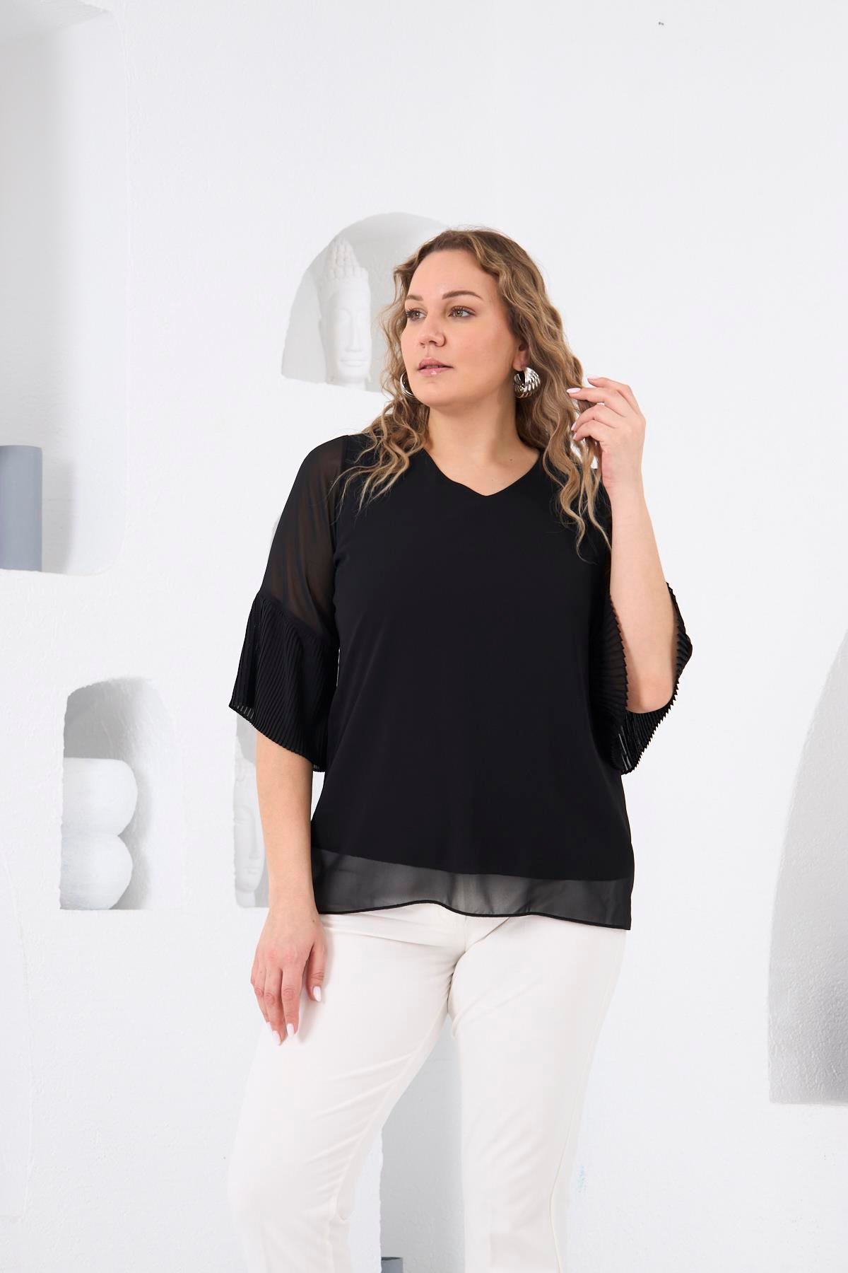 Kolları Piliseli Büyük Beden Siyah Bluz (O6164-SİYAH)