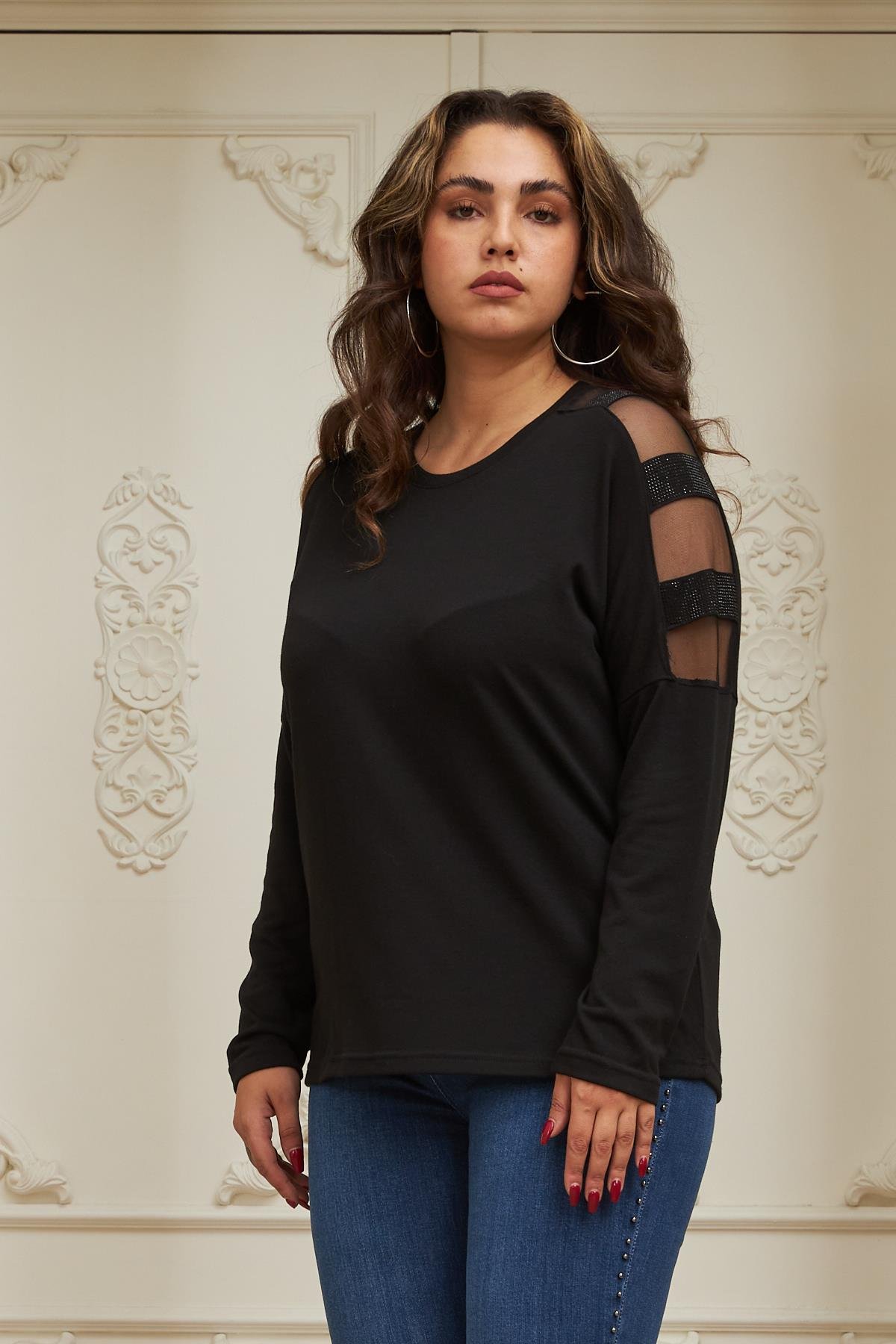 Kolları Tül ve Taş Detaylı Büyük Beden Siyah Bluz (O5018-SİYAH)