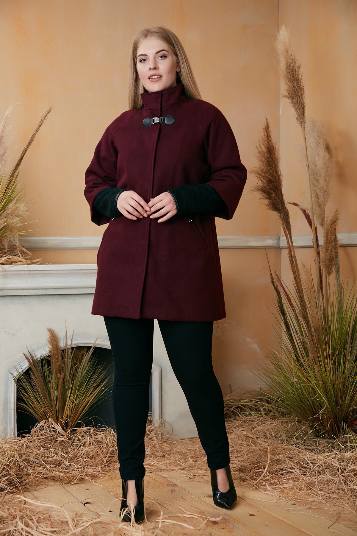 RMG Kolu Triko Detaylı Büyük Beden Kaşe Kaban (9716-BORDO)