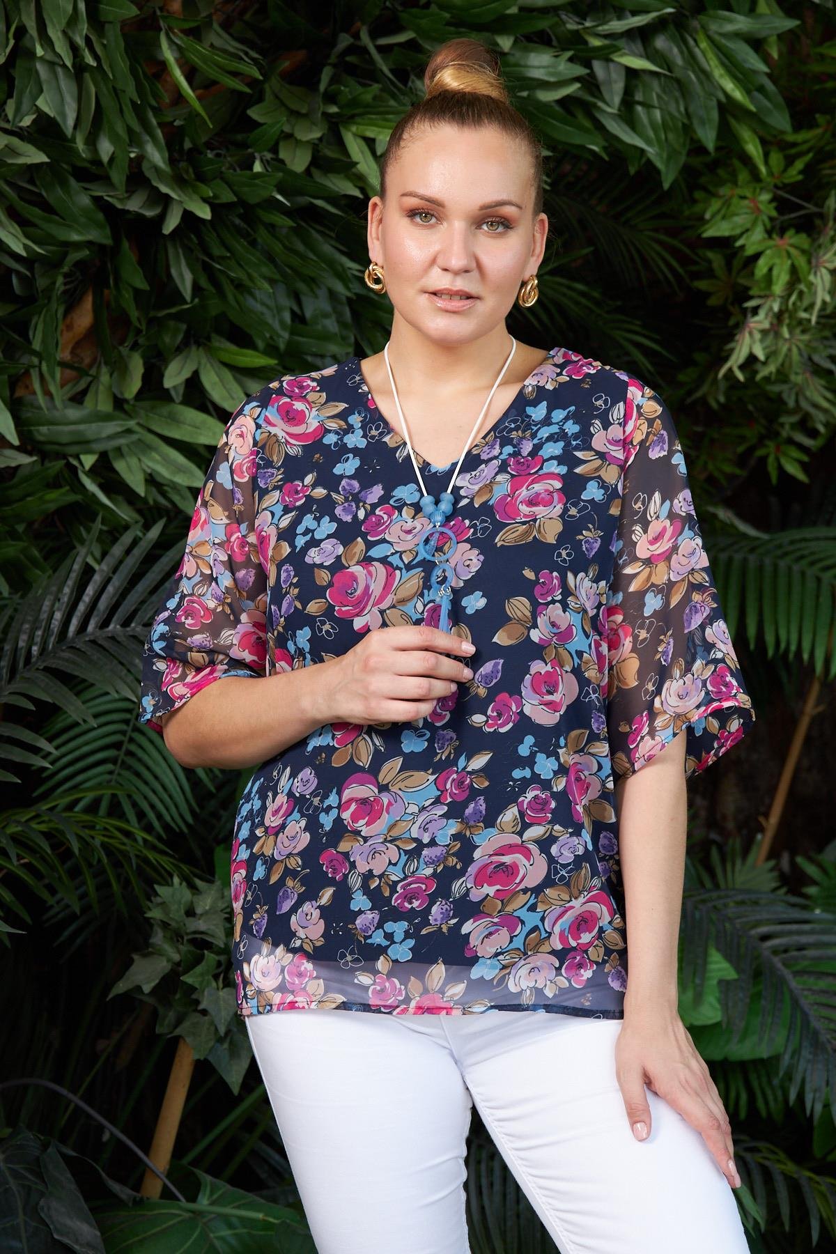 Kolye Detaylı Desenli Büyük Beden Lacivert Bluz (O5094-LACİVERT)