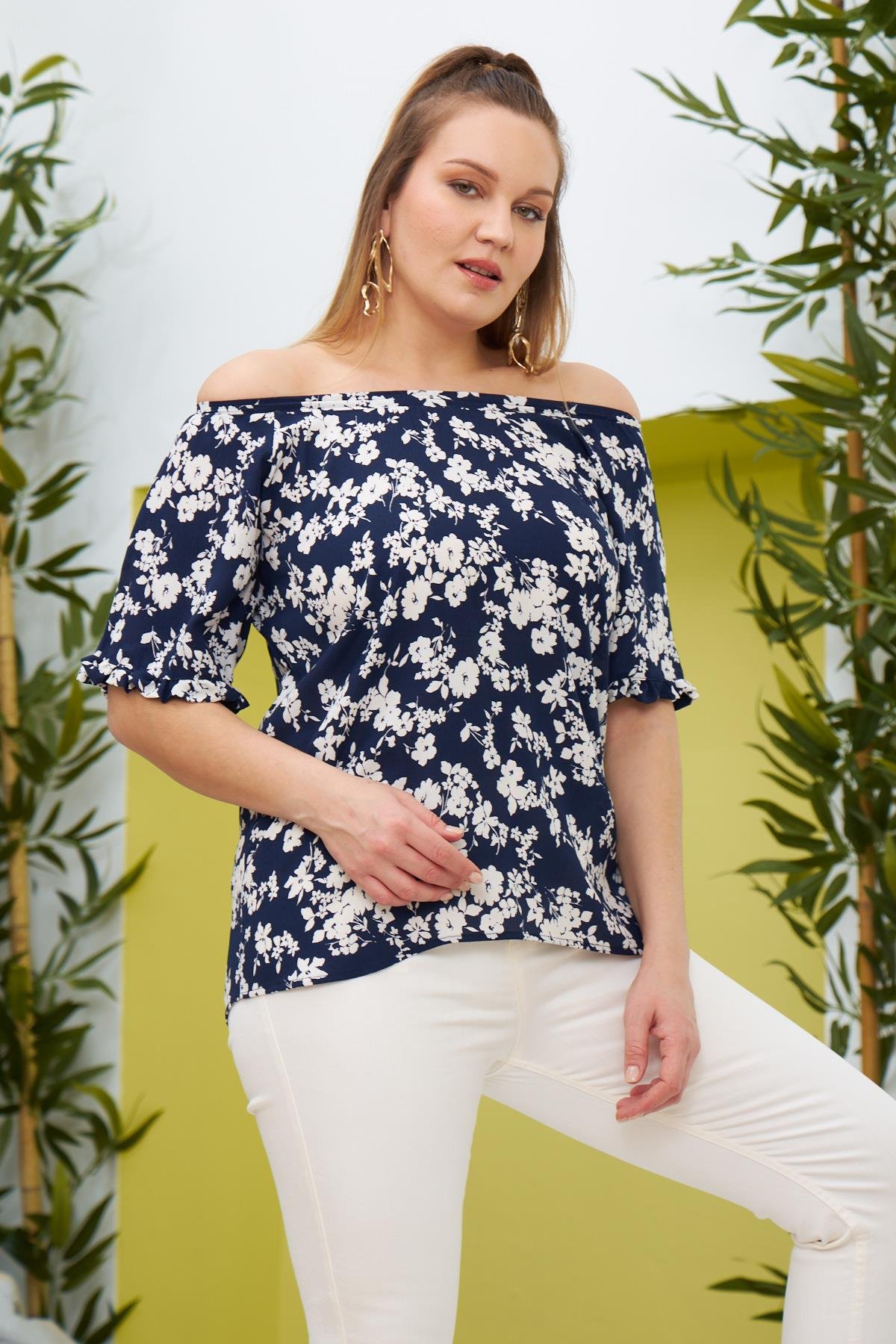 Lastikli Büyük Beden Lacivert Bluz (O6074-LACİVERT)