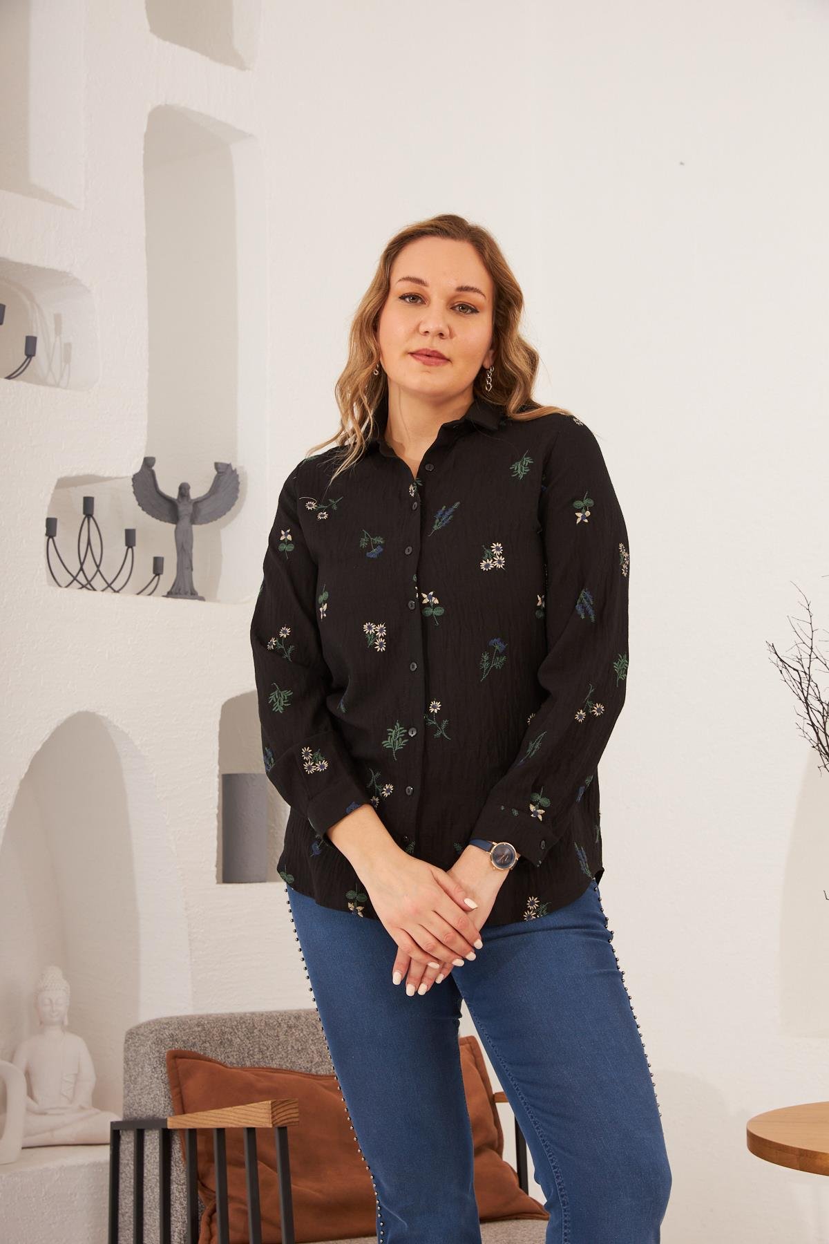 Nakışlı Büyük Beden Siyah Gömlek (O6427-SİYAH)