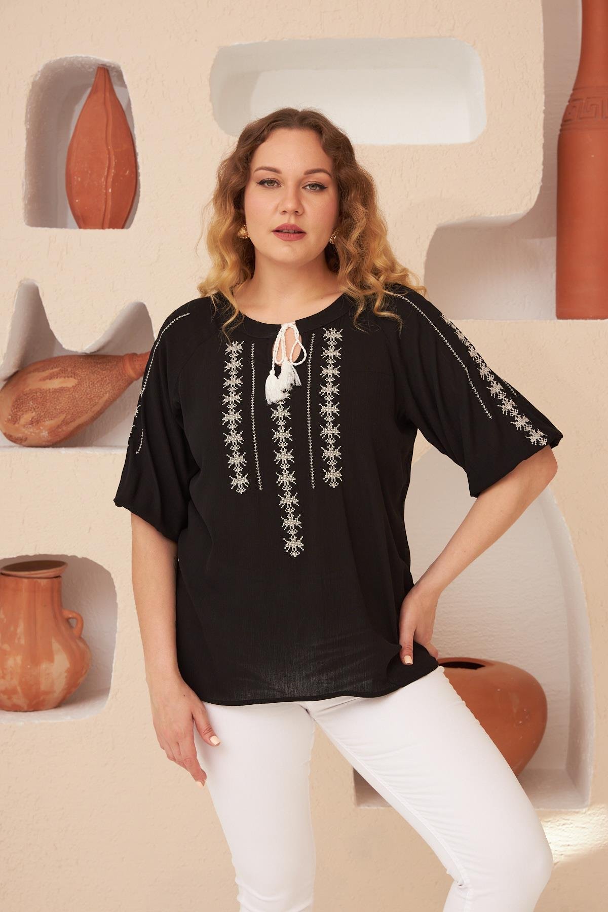 Nakışlı Kol Lastik Detaylı Büyük Beden Siyah Bluz (O6138-SİYAH)