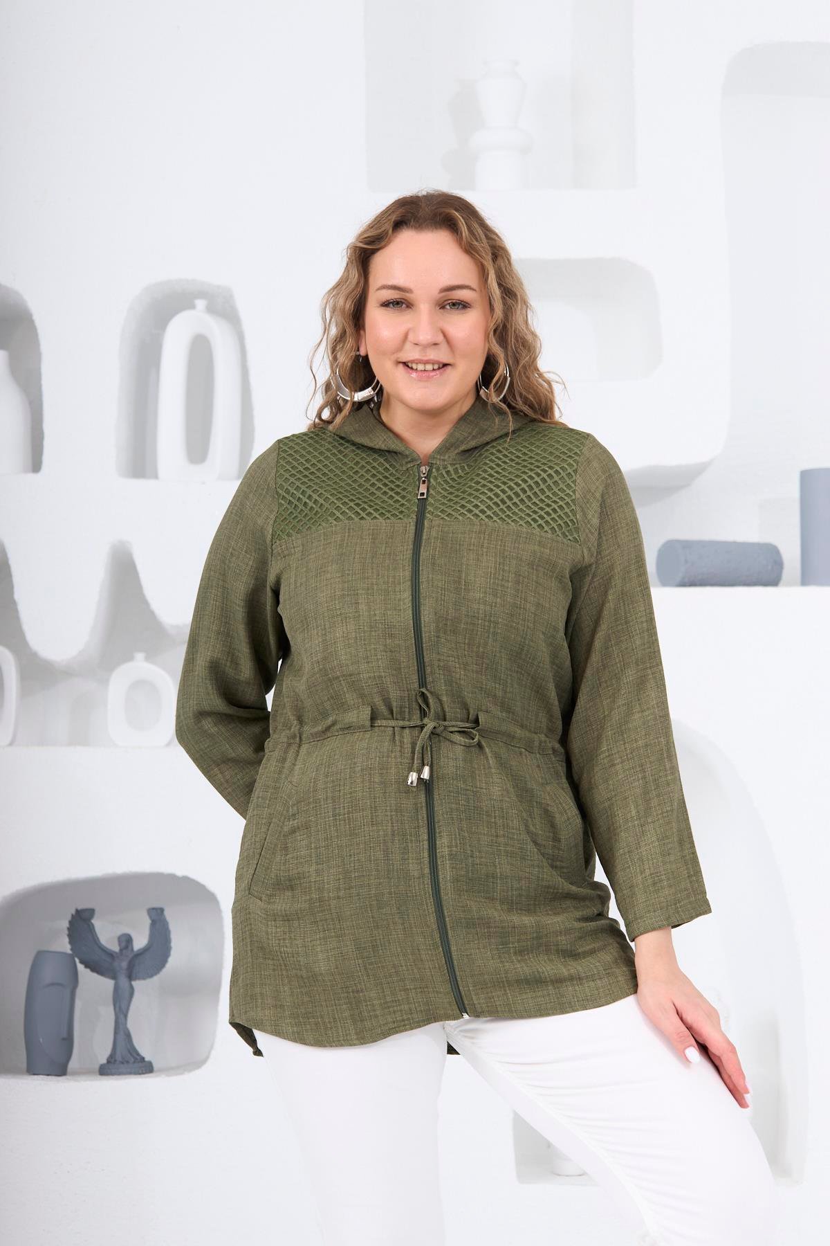 Omuz File Detaylı Keten Dokulu Büyük Beden Haki Ceket (O6290-HAKİ)