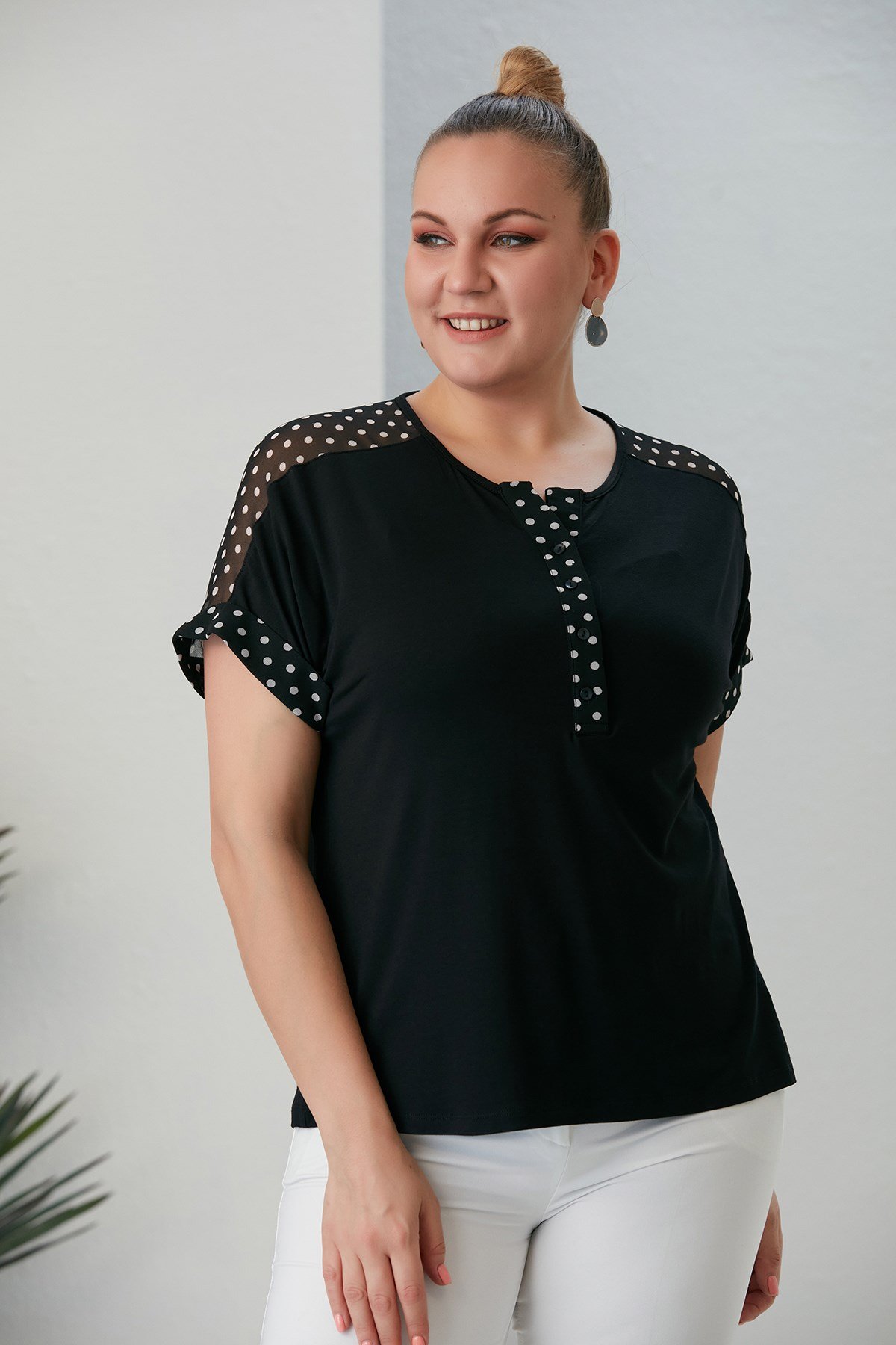 Omuz Tül Detaylı Puantiyeli Büyük Beden Siyah Tişört (O4949-SİYAH)