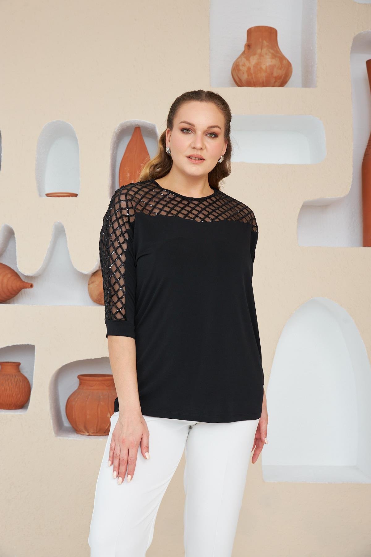Omuzları Dantel ve Pul Payet Detaylı Siyah Büyük Beden Bluz (O4537-SİYAH)