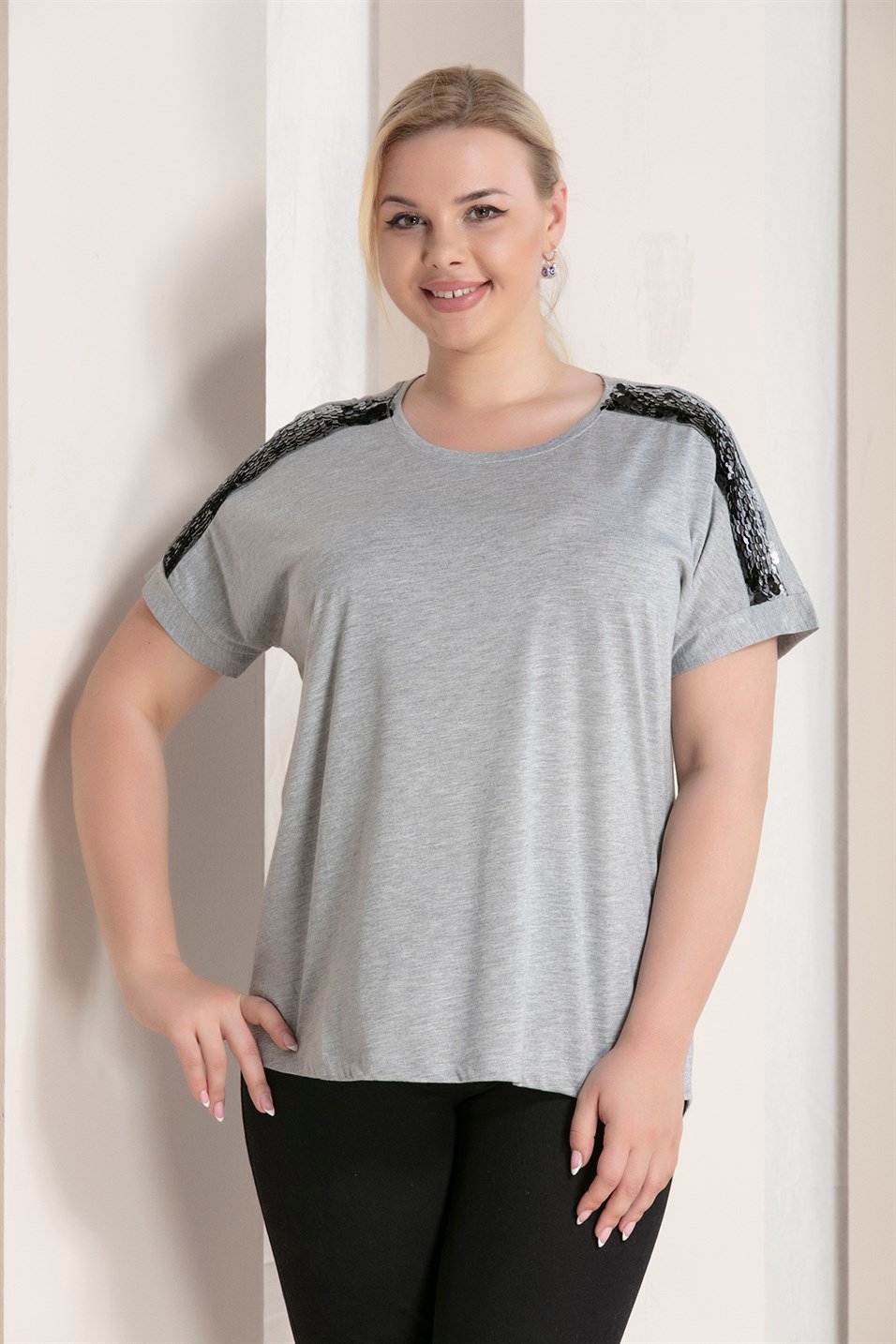 Rmg Omuzları Pul Payet Detaylı Büyük Beden Tişört Gri (6702Y-GRİ)